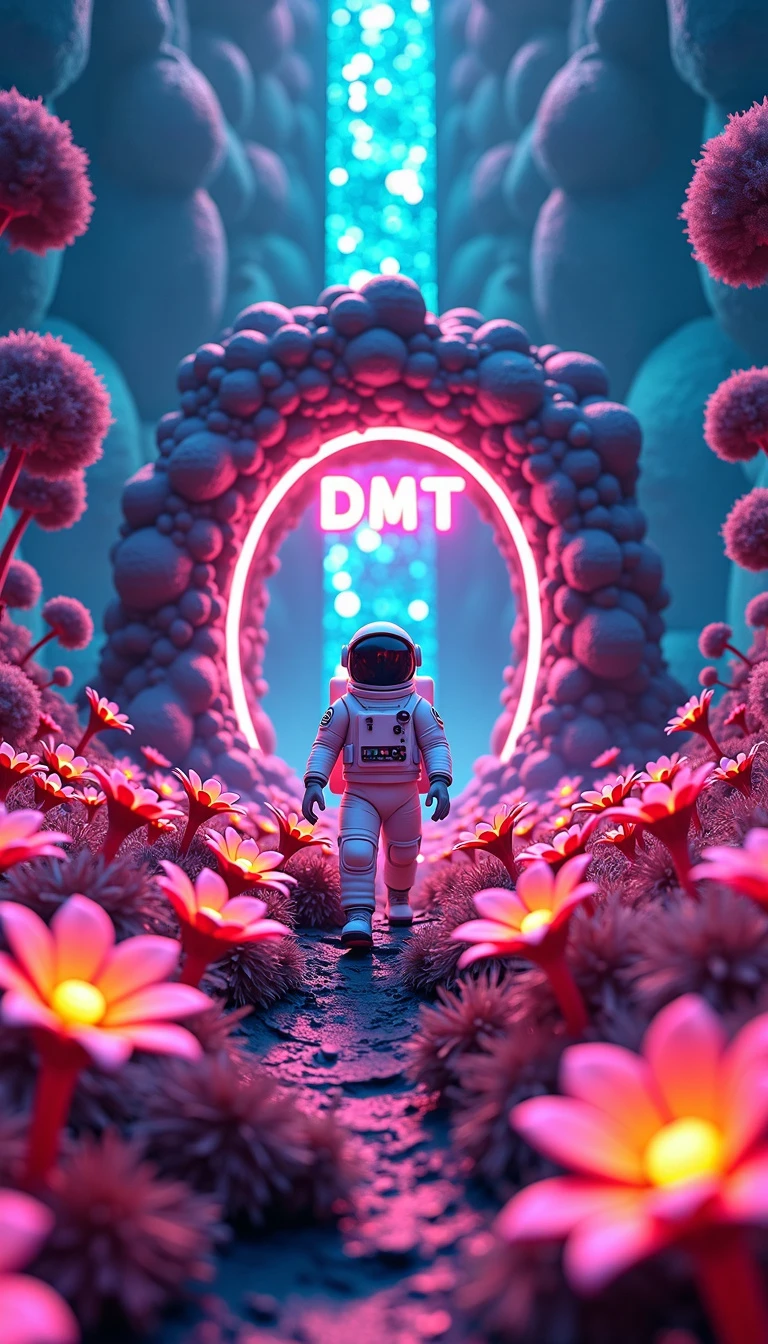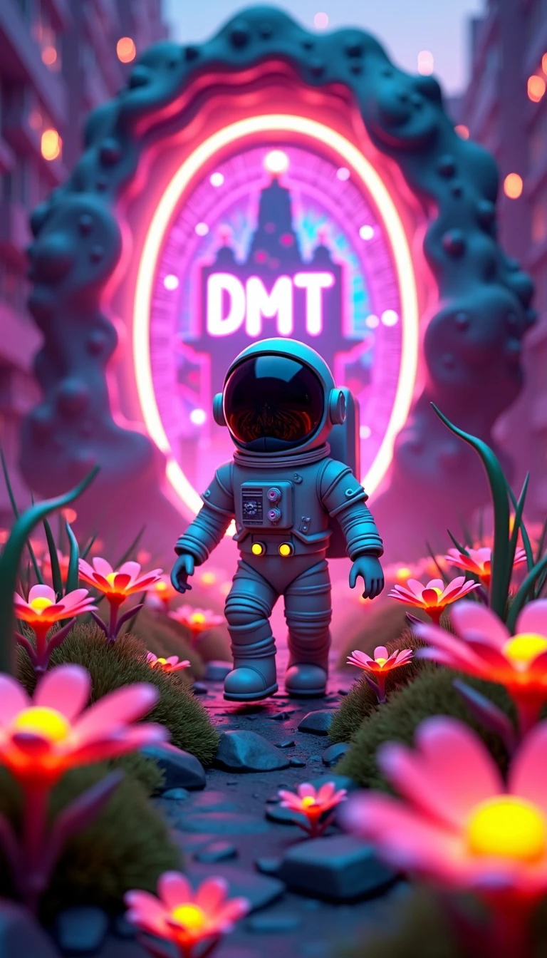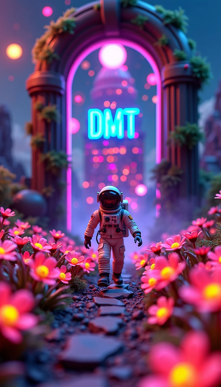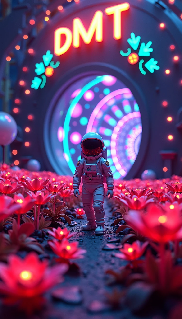 Create A psychological unhinged dmtcore 3D claymation-style psychonautics inspiration from DMT experiences and unhinged surreal imagery of a trippy astronaut, walk through a field of glowing neon flowers, In the background, is a oversized portal with a kaleidoscopic building insides that has a neon sign that says “DMT”. scene and lighting should be dark and neon under tone