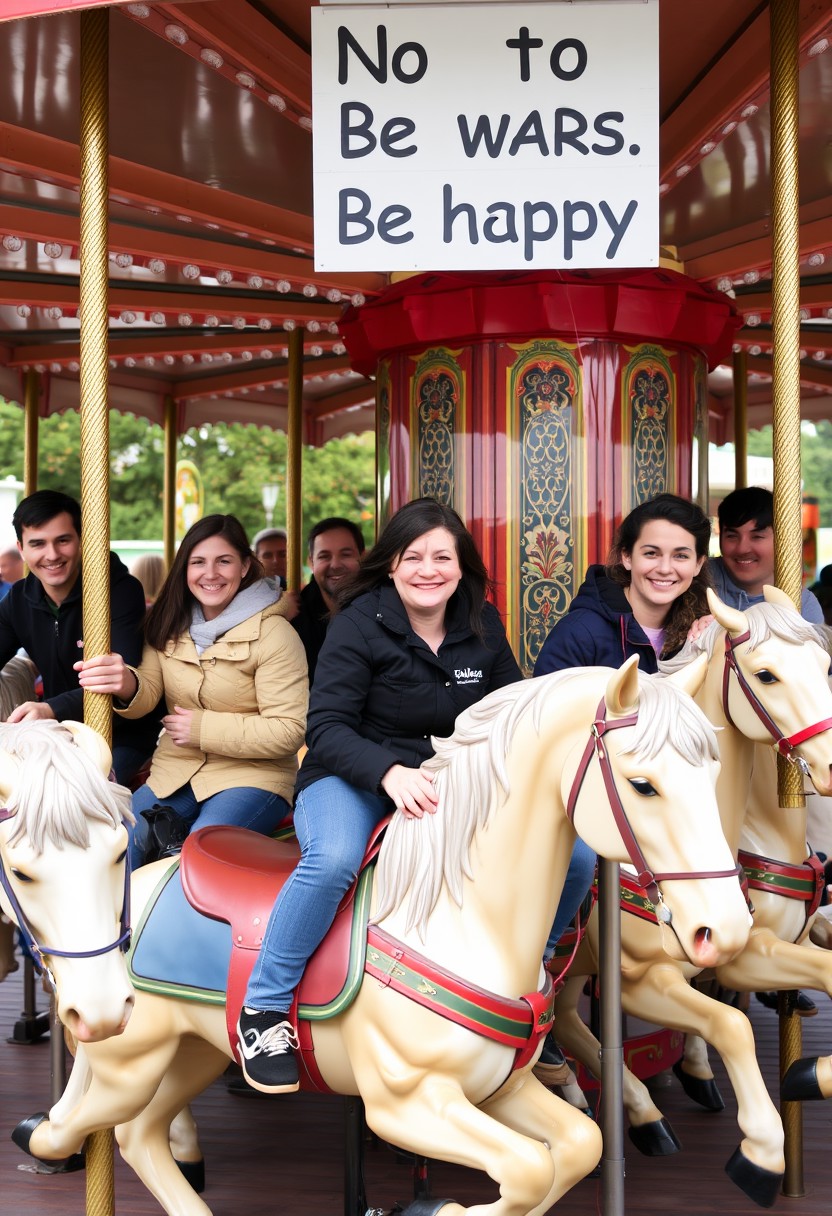 Group of people, men and women, in an amusement park, on a horse carousel, all seated on the horses, very smiley individuals with a sign that says no to wars, be happy.