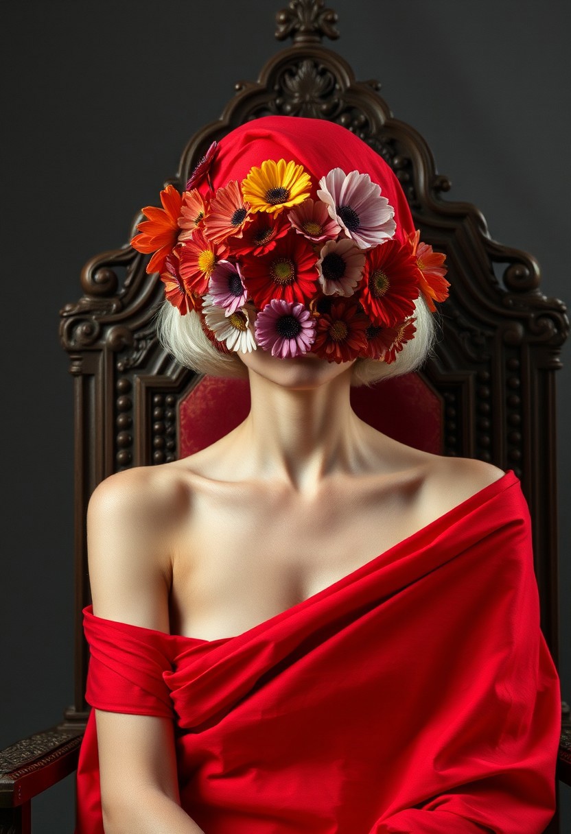 A woman full covered under red faceless sheet sat down on a throne, A breathtaking, exquisitely detailed RAW color photograph, capturing a masterpiece of realism with fine grain and crisp clarity. The image presents a stunning and captivating scene with brilliant lighting and a magnificent composition that adheres to the rule of thirds. Showcasing award-winning quality and incredibly realistic detail, the Rembrandt lighting adds depth and contrast, while the dynamic, film-style composition evokes the elegance of a world-famous painting. The final result is a lustrous, high-resolution image with rich detail and delicate, exquisite grain, making it ideal for wallpaper art or product shots. The centered composition emphasizes the subject, creating a strong, magnificent visual that serves as the perfect backdrop. Surrealism theme, master photography, high-end gray background, close-up of the upper body of a white mushroom-headed short-haired beauty, beautiful neck and collarbone, she has no face, her face is replaced by flowers of various colors, the focus of the picture is the weird combination of these flowers and people, beauty and horror,