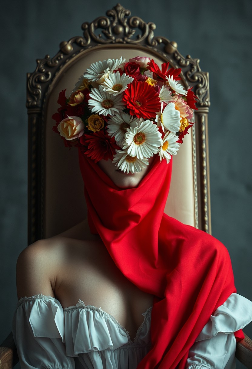 A woman full covered under red faceless sheet sat down on a throne, A breathtaking, exquisitely detailed RAW color photograph, capturing a masterpiece of realism with fine grain and crisp clarity. The image presents a stunning and captivating scene with brilliant lighting and a magnificent composition that adheres to the rule of thirds. Showcasing award-winning quality and incredibly realistic detail, the Rembrandt lighting adds depth and contrast, while the dynamic, film-style composition evokes the elegance of a world-famous painting. The final result is a lustrous, high-resolution image with rich detail and delicate, exquisite grain, making it ideal for wallpaper art or product shots. The centered composition emphasizes the subject, creating a strong, magnificent visual that serves as the perfect backdrop. Surrealism theme, master photography, high-end gray background, close-up of the upper body of a white mushroom-headed short-haired beauty, beautiful neck and collarbone, she has no face, her face is replaced by flowers of various colors, the focus of the picture is the weird combination of these flowers and people, beauty and horror,