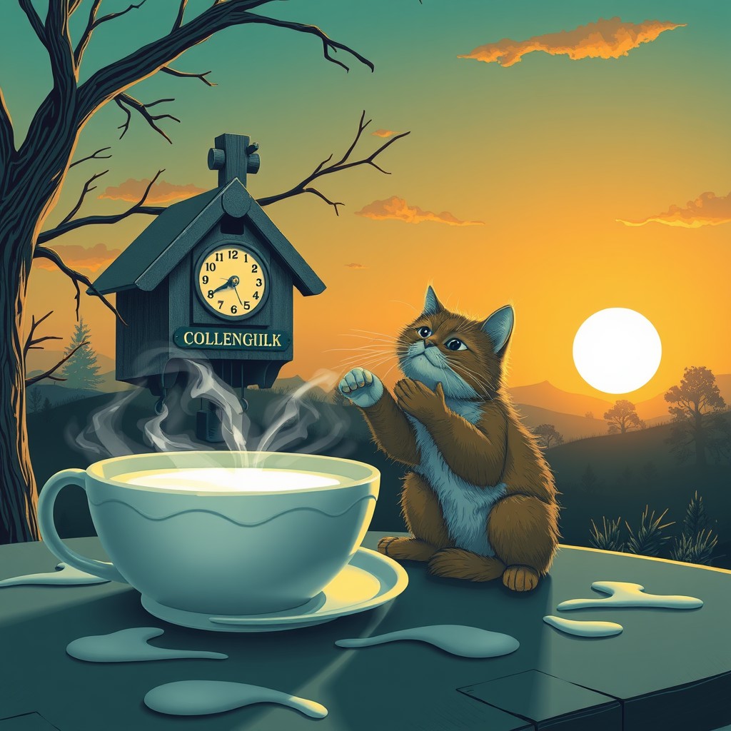 as the sun sets over a saucer of milk the cat sings to a cuckoo clock, heavy metal album cover