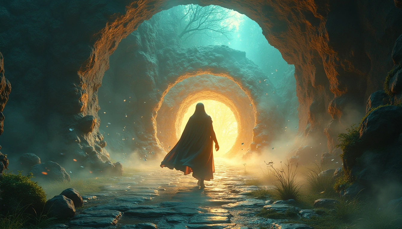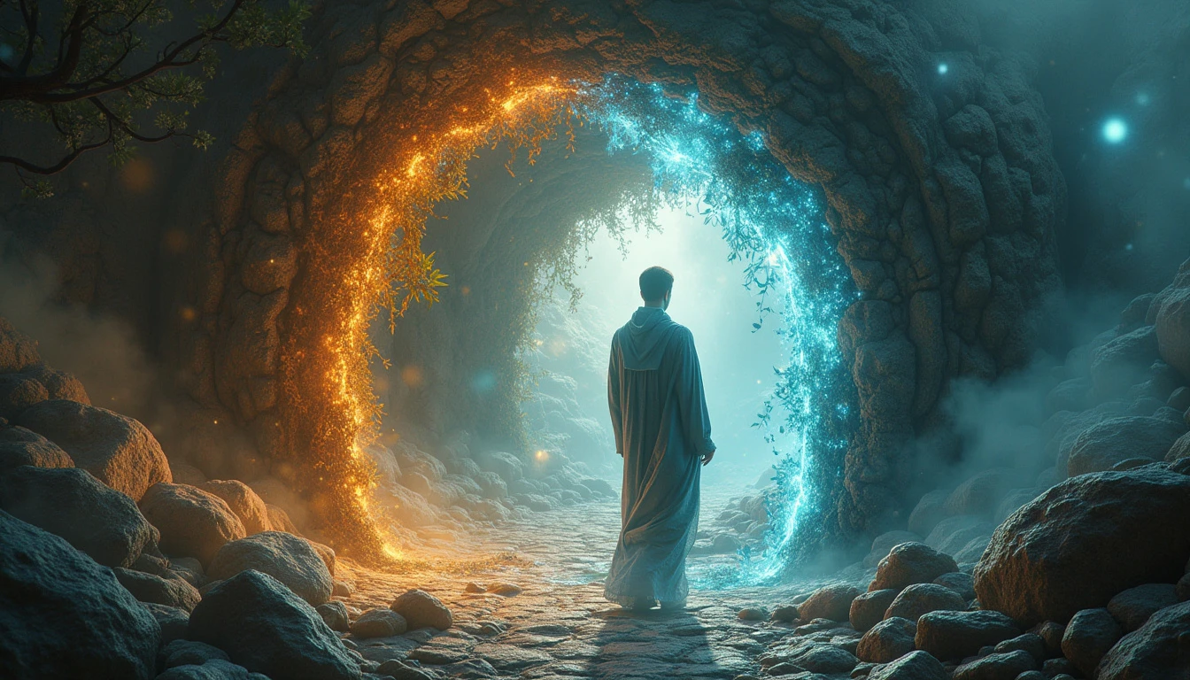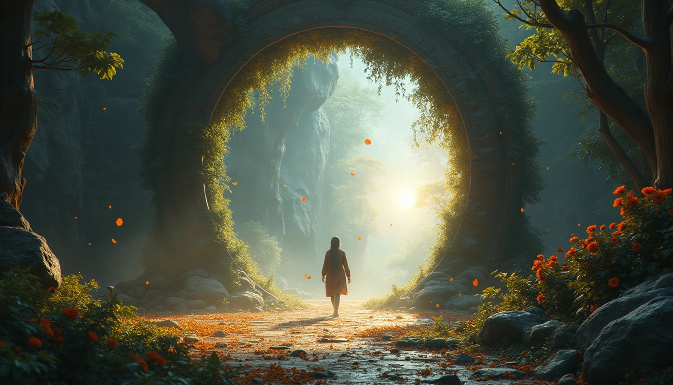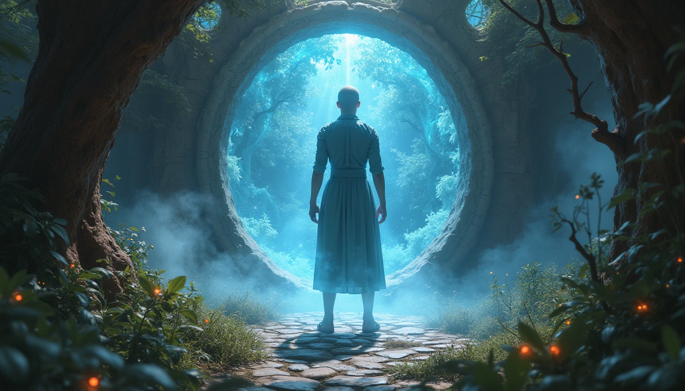 Portal of Projections: A mystical portal in a fantasy setting that, when passed through, transforms the person into a version of themselves completely shaped by their projections. The surrounding environment also changes as the projections manifest themselves, sometimes bright, sometimes dark, creating a visual journey between light and inner shadow.