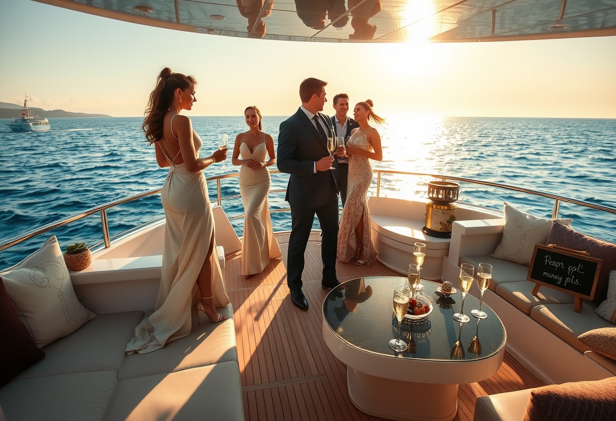 Create an opulent scene set on the deck of a luxurious yacht sailing through the tranquil, azure waters of a glamorous Mediterranean sea. The scene features a group of elegantly dressed individuals, showcasing high fashion and impeccable style. The women are adorned in stunning evening gowns and high heels, with flowing fabrics and intricate details catching the sunlight. The men wear tailored suits with a touch of casual sophistication. The setting includes plush, stylish furniture, champagne glasses, and tasteful decorations, all bathed in the warm, golden glow of a setting sun. In a subtle but visible corner of the yacht, include a humorous sign that reads, “Poor ppl give us money pls,” adding a touch of irony and contrast to the otherwise lavish scene. The mood should be seductive yet refined, with a sense of richness and allure permeating the atmosphere.