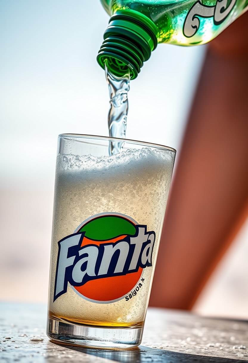 "A close-up shot of a Sprite bottle tilted as it pours its watery, fizzy liquid into a glass branded with the Fanta logo. The carbonated drink fizzes and bubbles up, with the foam rising to the rim of the glass. The contrast between the Sprite bottle and the Fanta glass creates a playful and slightly provocative image. The background is of a beach during summer, focusing attention on the glass and the interaction between the two iconic brands. The lighting highlights the glass, making the logos and the effervescent liquid stand out, creating a striking and visually engaging scene."