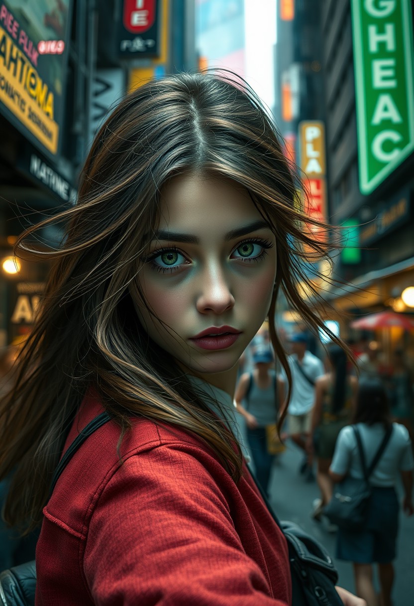 (extremely intricate:1.3), (realistic), photo of a girl in a bustling metropolis, weaving through crowded streets and dark alleyways, close up, Detailed clothes, green eyes, flowing hair, determined expression, shiny glossy skin, subsurface scattering, (sharp:0.7), [(colorful explosion psychedelic paint colors:1.21)::0.05], amazing fine detail, Nikon D850 film stock photograph Kodak Portra 400 camera f1.6 lens, rich colors, lifelike texture, dramatic lighting, urban environment, skyscrapers, neon signs, street vendors, dynamic composition, unreal engine, trending on ArtStation, cinestill 800 tungsten , volumetrics dtx, (film grain, blurry background, blurry foreground, bokeh, depth of field, motion blur:1.3)