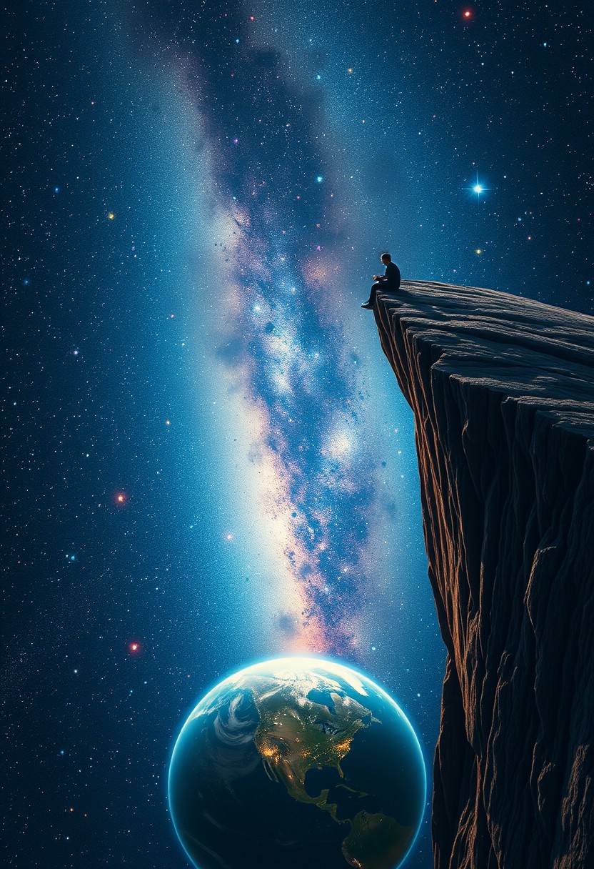 One man sitting on the edge of a cliff in space, legs hanging over the edge, gazing down at his palms, one planet below, stars and galaxies fill the background with vibrant colors,