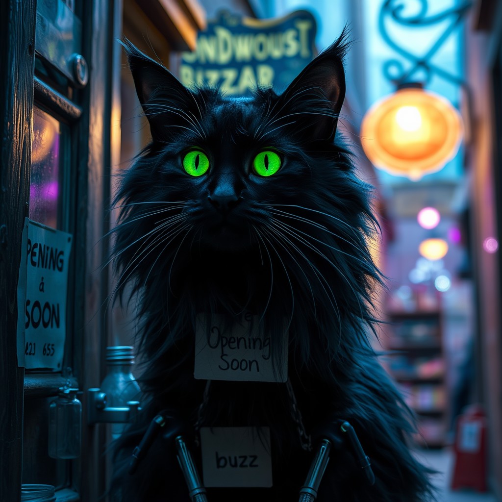 Highly detailed, 4k. Off in the distance A mystical long haired black cat with glowing neon green eyes with and ethereal glow that has cybernetic prosthetic limbs . Located in a back ally with lights in rich blues, teals, and purples, suggesting a mysterious environment creating a dreamlike, ethereal atmosphere. Off in the distance the cat sits in a shop window that has sign above the shops door that reads " The Wondrous Bizzar" On the door hangs a sign that reads " Opening Soon". The cat’s bright, piercing eyes draw attention to the shop that's off in the distance. Beside the bottom of the shop door is a clear jar that has "buzz" written on it. The Shop seems to be filled with strange prosthetic parts that appear to be otherworldly.