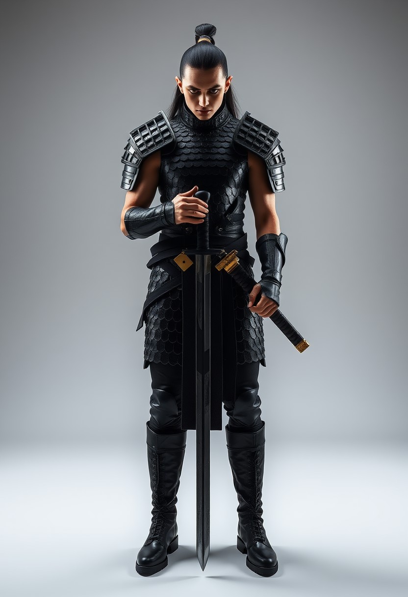 full shot, Symmetrical front view of Sevdaliza, beautiful, erotic pose, scale armour, He carries two katanas crossed on his back held by straps, fashion tall boots, masterful photography studio