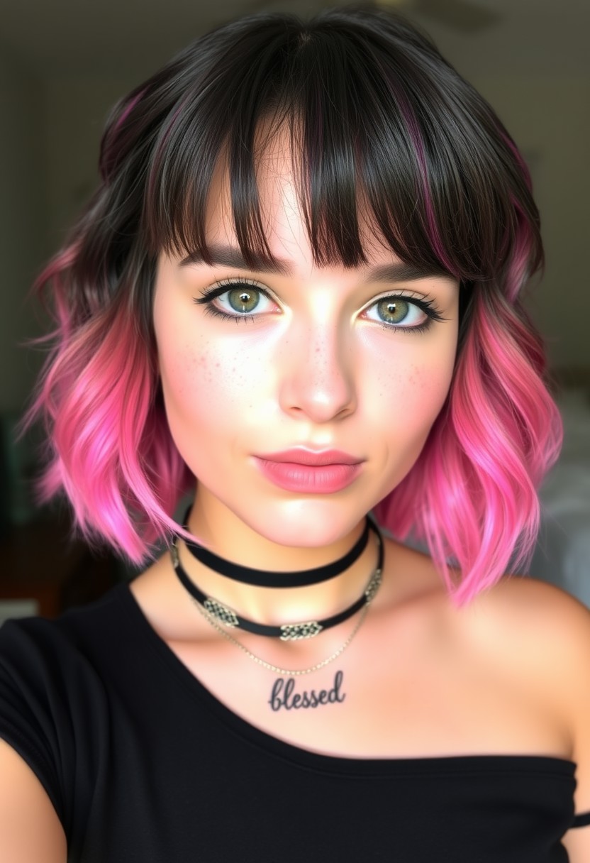 The woman in the image has short, wavy hair that transitions from dark roots to a vibrant pink color. She has a straight fringe that covers her forehead. Her makeup is well-applied, with defined eyebrows, eyeliner, and a natural lip color. She has light skin with visible freckles on her face, giving her a youthful appearance. She is wearing a black choker and a chain necklace, along with a black top that has a subtle dotted texture. A small tattoo on her chest reads blessed