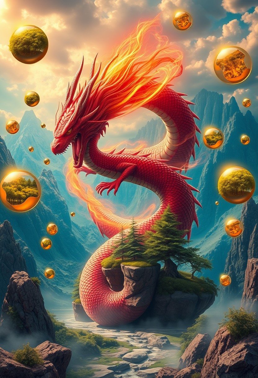 /imagine prompt: A surreal, dreamlike landscape unfolds, where reality bends and twists into impossible forms. At the center, a majestic dragon with flowing, red scales is caught in an eternal chase, shaped like a figure 8, its body weaving through a figure 8 infinity loop, The dragon’s mouth is wide open, exhaling vibrant energy that seems to breathe life into the strange world around it. Floating in the air, golden spheres hover, some cracked open to reveal miniature forests growing within, as if entire ecosystems are contained inside these radiant orbs.