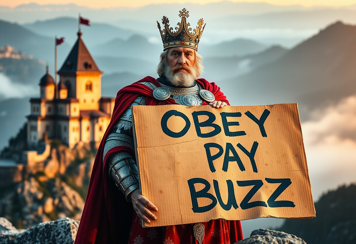 Generate an image of a unique medieval king of Albania standing on a rocky mountain with a majestic castle in the background. The king is dressed in ornate, culturally inspired armor, wearing a crown with ancient symbols, and a flowing red cape. His expression is stern and commanding. He holds a large, weathered cardboard sign that reads “OBEY PAY BUZZ” in bold, rough letters. The scene is set at dawn, with a misty, golden sunrise casting a mystical light over the king and the landscape, emphasizing the powerful and enigmatic message on the sign.