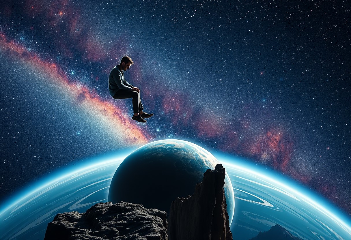 One man sitting on the edge of a cliff in space, legs hanging over the edge, gazing down at his palms, one planet below, stars and galaxies fill the background with vibrant colors,