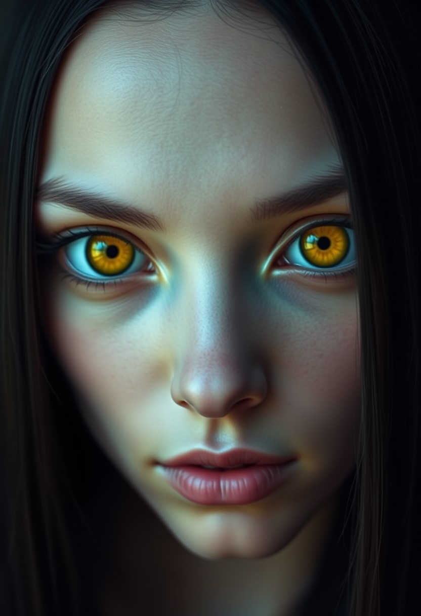 Photographic portrait of a beautiful alien woman with solid yellow eyes, pupil-less, no iris, long straight black hair.