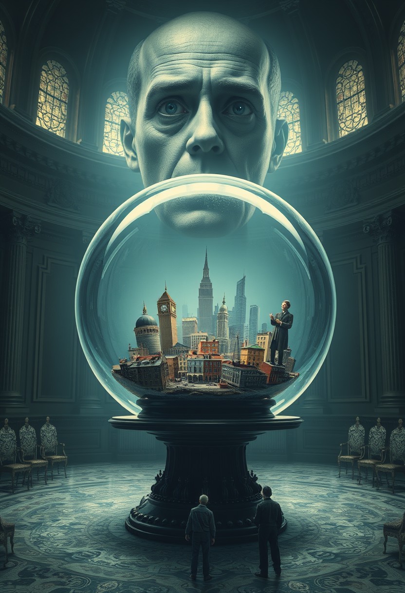 The image depicts a city trapped within a glass sphere, a delicate yet impenetrable prison that isolates it from the outside world. This sphere rests on a table in a grand hall. Inside the sphere, the tiny inhabitants of the city, aware of their confinement, look up with awe and terror. They see a giant face looming above them, peering down into their world. For them, this person outside the sphere fills the sky like an omnipotent being, creating a blend of fascination and fear as they observe this colossal figure. The hall remains eerily silent, heightening the drama of the scene. The encounter between the tiny observers inside the sphere and the observed figure outside is filled with wonder and subtle horror. Both sides experience a strange mix of power and vulnerability in a moment that is deeply unsettling and captivating.