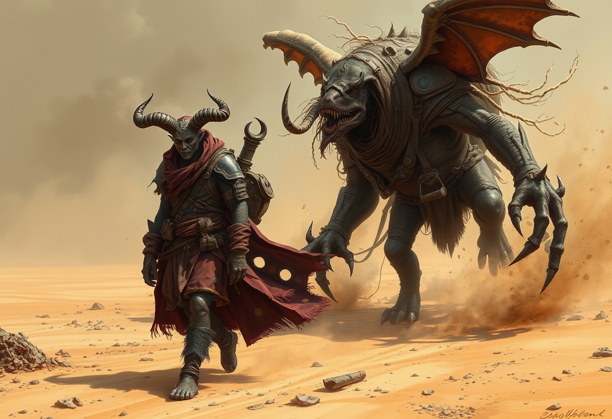 b@rl0w3, A highly detailed fantastical picture of demon in traveling skins wandering the wastelands of hell. Walking with a large hell creature covered in gear. High winds causing sand and debris to kick up against them