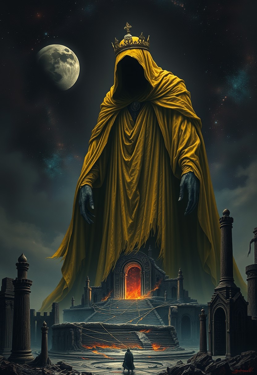 dark lovecraftian art by Jarek Kubicki, giant cyclopean yellow hooded entity in tattered cloak and crown towers over the ruins of the throne room, damascus steel maze labyrinth ruins landscape background, full black moon and epic nebulas skies,wide shot, cosmic horror, hastur, monster, faceless,