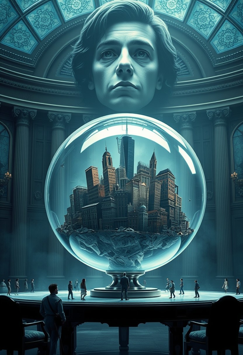 The image depicts a city trapped within a glass sphere, a delicate yet impenetrable prison that isolates it from the outside world. This sphere rests on a table in a grand hall. Inside the sphere, the tiny inhabitants of the city, aware of their confinement, look up with awe and terror. They see a giant face looming above them, peering down into their world. For them, this person outside the sphere fills the sky like an omnipotent being, creating a blend of fascination and fear as they observe this colossal figure. The hall remains eerily silent, heightening the drama of the scene. The encounter between the tiny observers inside the sphere and the observed figure outside is filled with wonder and subtle horror. Both sides experience a strange mix of power and vulnerability in a moment that is deeply unsettling and captivating.