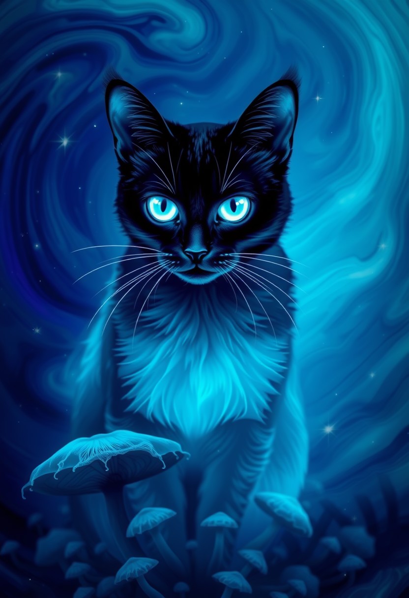 Highly detailed glowing blue ethereal ghost like almost see-through black cat with glowing white eyes. Swirling background composed of rich blues, teals, and purples, suggesting a mystical with cosmic stars environment. The backdrop appears almost liquid, with the colors merging and flowing into one another, creating a dreamlike, ethereal atmosphere. Below the cat, abstract, mushroom-like forms and organic shapes emerge, enhancing the otherworldly feel of the image. The cat’s bright, piercing eyes draw attention, making it the focal point of this enchanting and mysterious scene, as if it exists within a magical or alternate dimension.