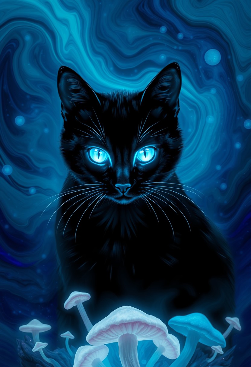 Highly detailed glowing blue ethereal ghost like black cat with glowing white eyes. Swirling background composed of rich blues, teals, and purples, suggesting a mystical or cosmic environment. The backdrop appears almost liquid, with the colors merging and flowing into one another, creating a dreamlike, ethereal atmosphere. Below the cat, abstract, mushroom-like forms and organic shapes emerge, enhancing the otherworldly feel of the image. The cat’s bright, piercing eyes draw attention, making it the focal point of this enchanting and mysterious scene, as if it exists within a magical or alternate dimension.