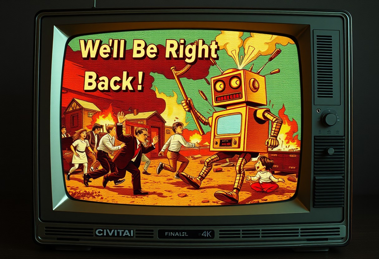 high-definition modern reimagining of classic RCA analog test pattern on a tv set, which shows an absurdist image of a terrified television production crew fleeing from a haywire retro computer mainframe robot, which is angrily waving a pitchfork as sparks emit from its CPUs; chaotic detail and several fires can be seen in the background. The image has a quaint and cheerful energy despite the havoc it portrays, and includes ONE INSTANCE of the exact text "We'll Be Right Back!" in classic broadcast font in the optimal position as well as the CIVITAI logo in place of the TV brand; the entire image is meant to humorously and adeptly emulate mid-century test patterns seen on broadcast television. Features consistent balanced composition, the characteristic lighting effect of a CRT television, and expertly-refined charming animation in vibrant atomic age style, authentic art, tongue-in-cheek visual humor, seamless layering, masterpiece quality, sharp borders, period-appropriate technicolor, flawless, finalist entry, upscaled to 4K