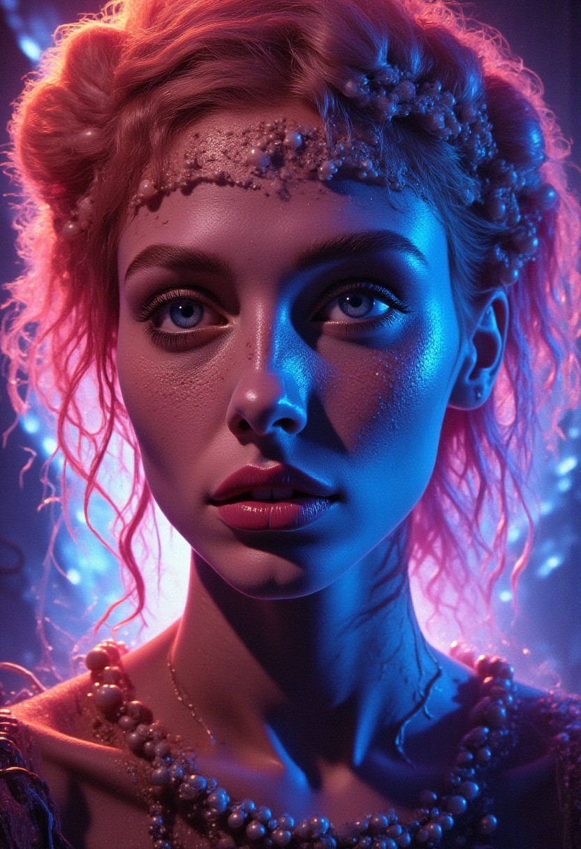highly detailed, complex composition, woman with pastel rainbow hair, large blue eyes, intricate hairstyle with pearls, glowing background, exaggerated background details, vibrant colors, intricate textures, dynamic lighting, whimsical and magical atmosphere