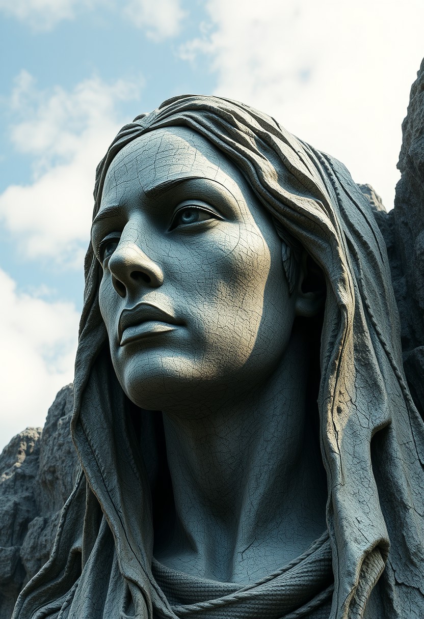 art statue in cliffs, in the style of realistic hyper-detailed portraits, cryengine, detailed facial features, ingrid baars, multi-panel compositions, guido van helten, concept art