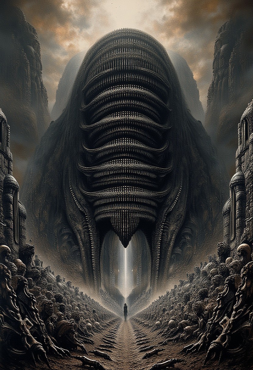 style of H. R. Giger, realistic painting, anime, well defined lines, cell shaded. waldobosch, hundreds of people, demons, hellscape, a large multiple tiered creature in the middle.