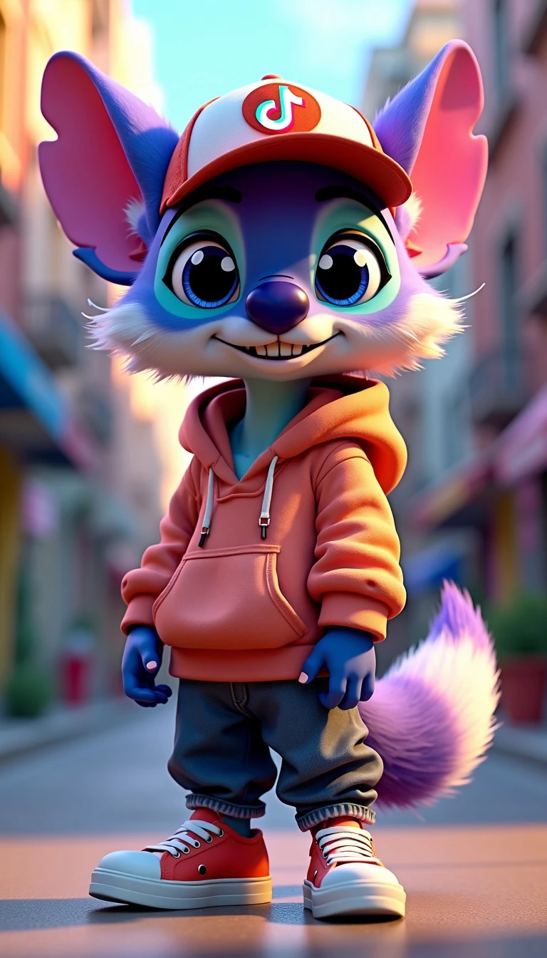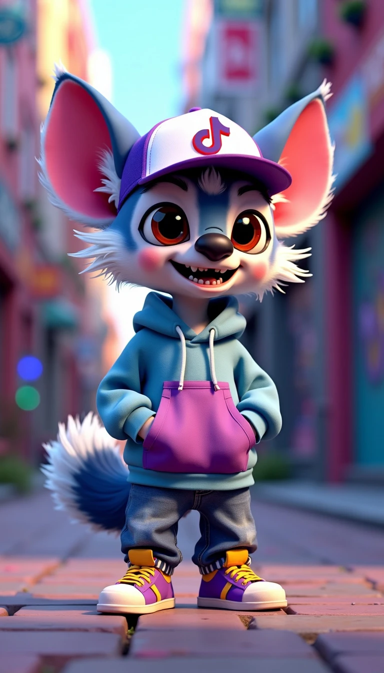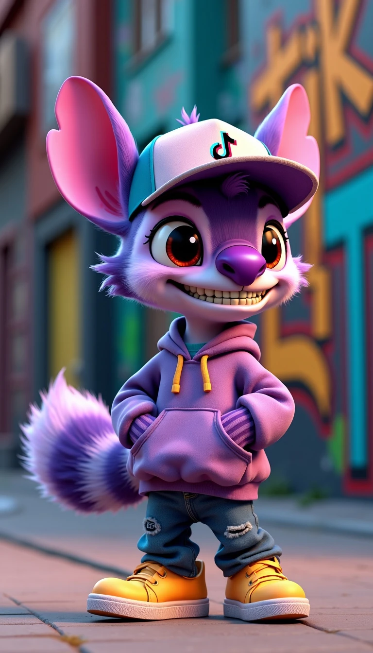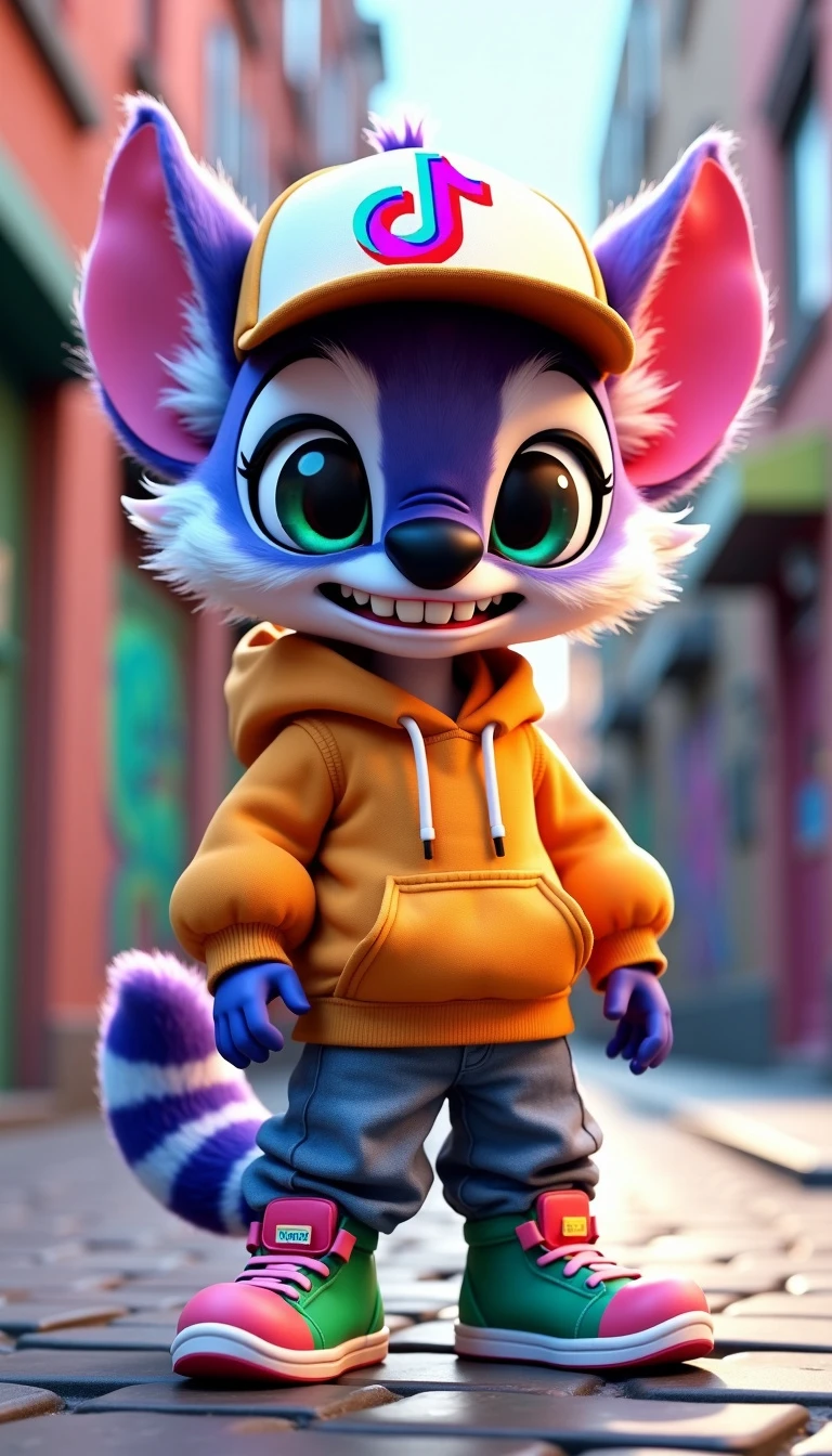 Create a vibrant 3D character named Stitchytiks, inspired by a blend of a lemur and a fox. Stitchytiks has large, expressive eyes and a playful grin. He wears a trendy trucker hat adorned with the TikTok logo, tilted slightly to one side. His outfit consists of urban clothing, including a stylish oversized hoodie, baggy jeans, and colorful sneakers. The character stands in a fun, dynamic pose, showcasing his mischievous personality against a colorful city backdrop filled with graffiti art and lively street elements. Realistic color is purple need like a circle photo for tiktok profile