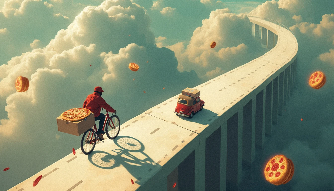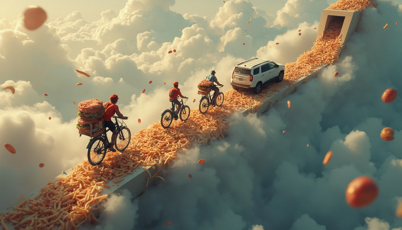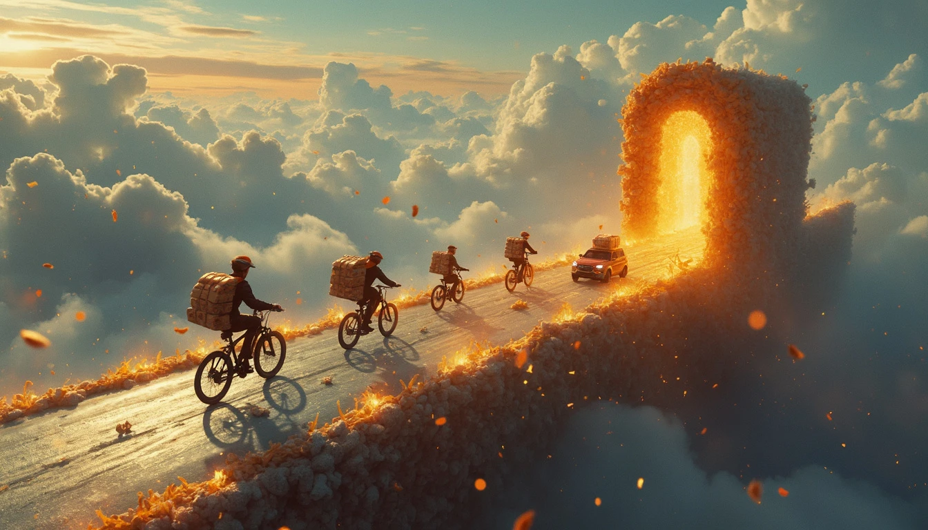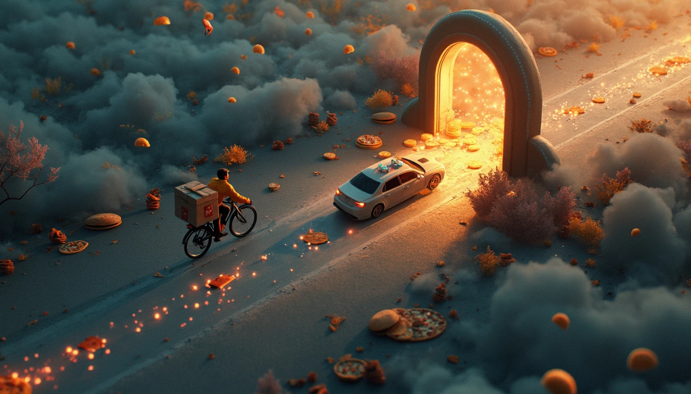 a surrealistic detailed image of an endless unlimited shape of a road , a bicycle courier with a pack of food on the back of it and 3 other courier behind them , pizza and burgers and frech fries falling from sky, a huge phone is standing on the way and a portal is opened into the phone and a courier car came out of portal, top view