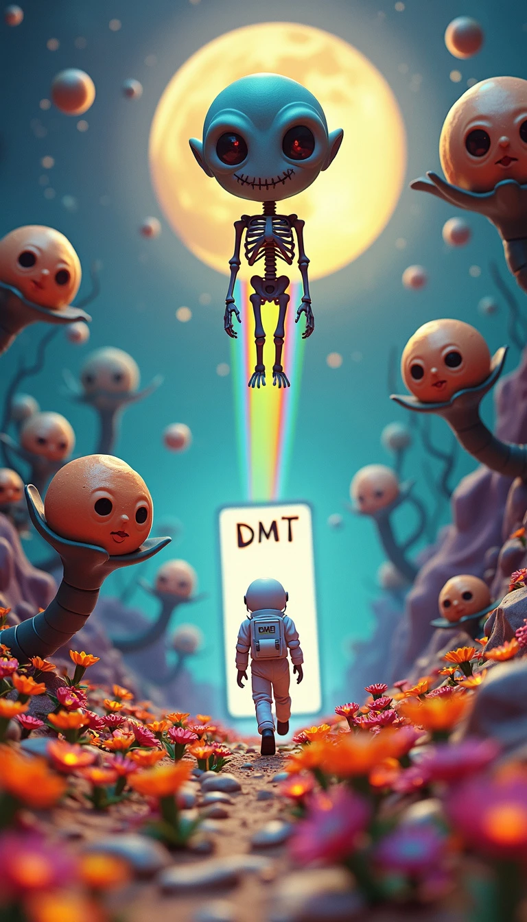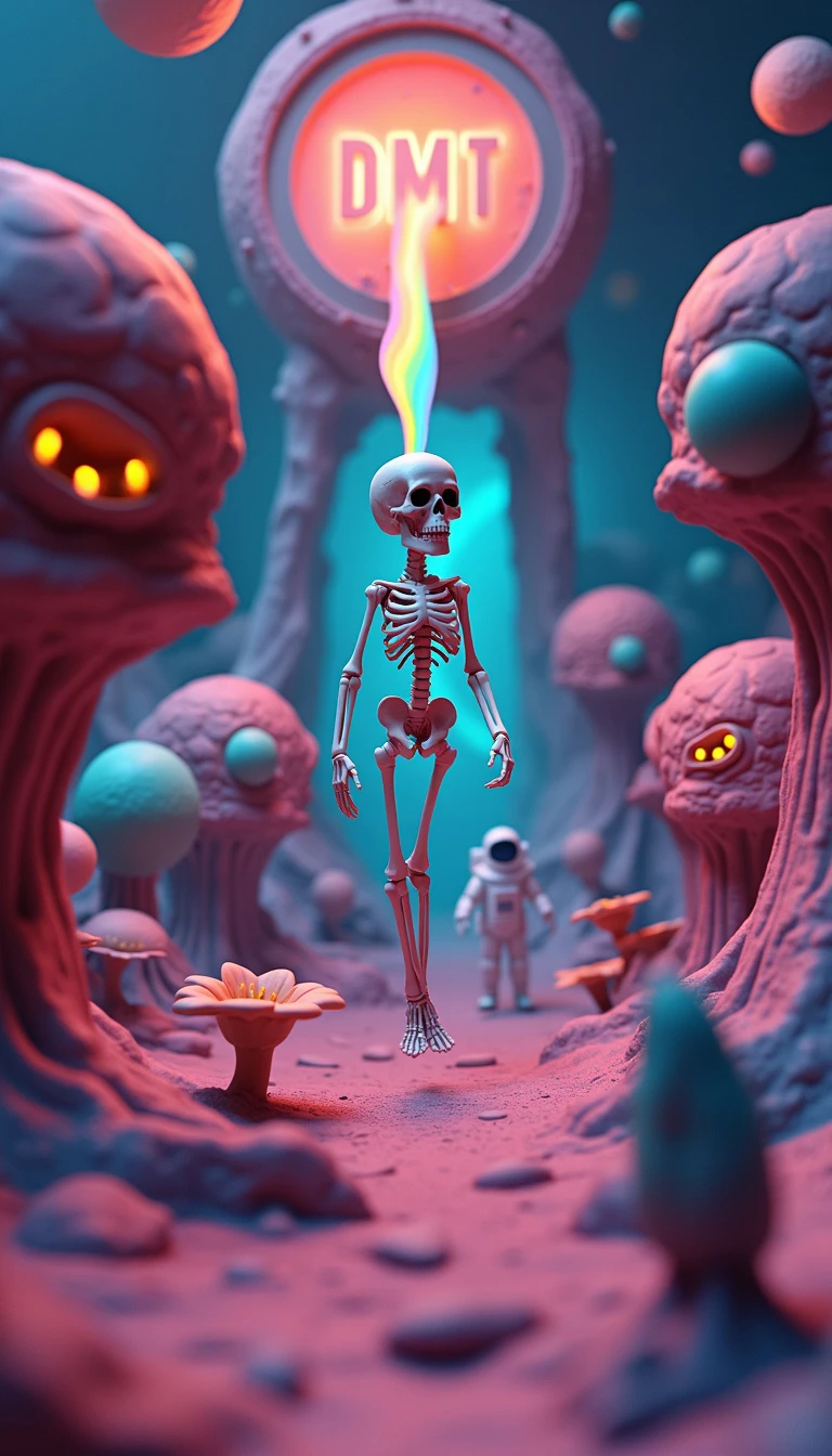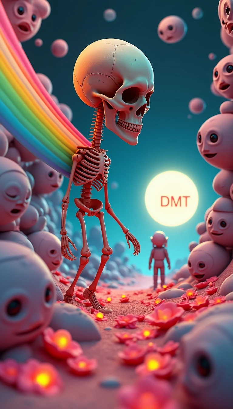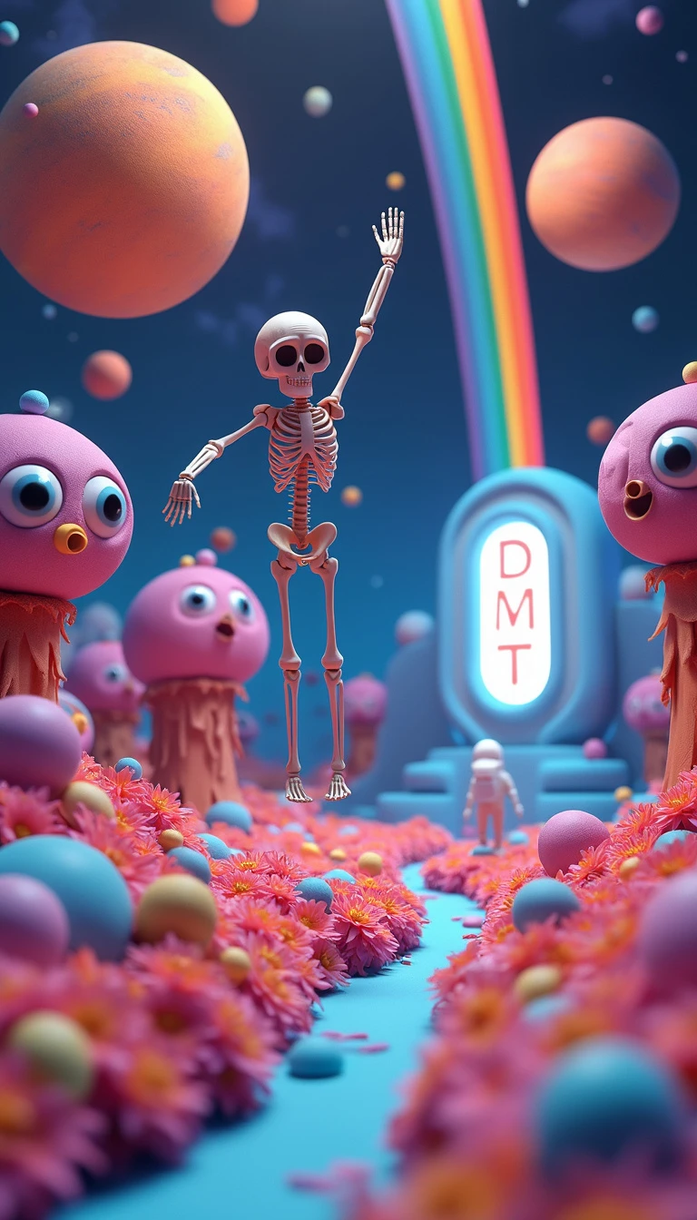 Design a psychological, hallucinogenic DMT-core 3D claymation scene. A skeletal figure levitates, propelled by a rainbow trail, amidst a landscape of alien, bulbous structures. Surrounding him, floating planets with expressive faces observe the scene. In the distance, a portal labeled “DMT” glows brightly, with an astronaut walking towards it, through a field of glowing, otherworldly flowers. The colors are vibrant, the textures soft and clay-like, and the atmosphere should be surreal, blending cosmic exploration with a sense of eerie, otherworldly wonder
