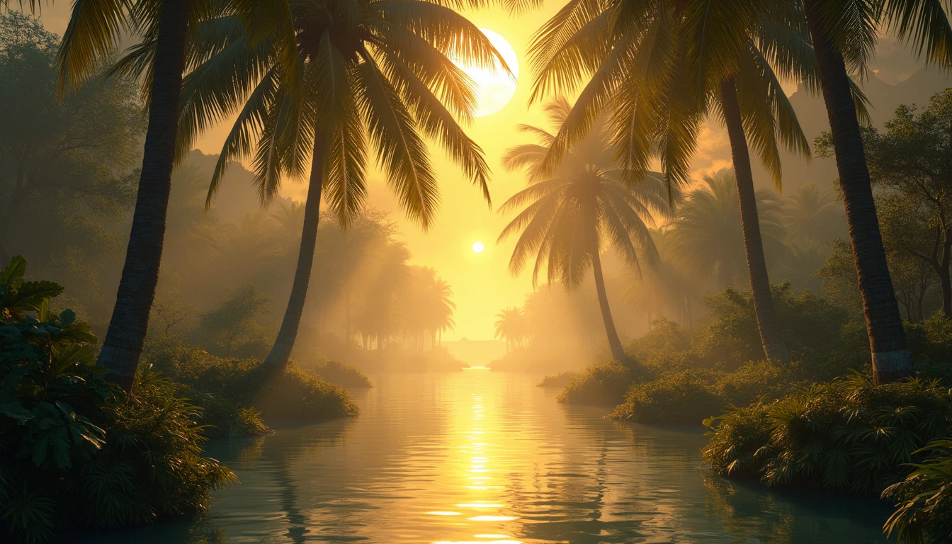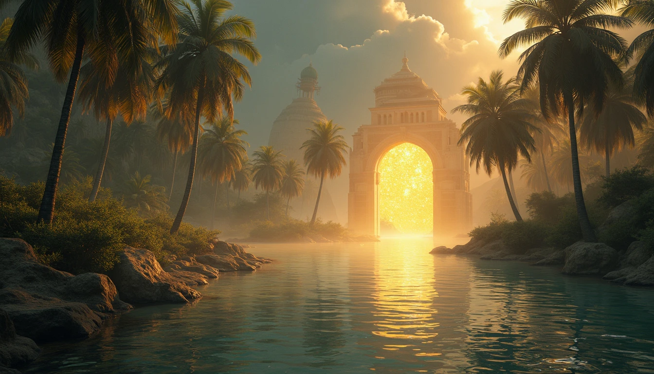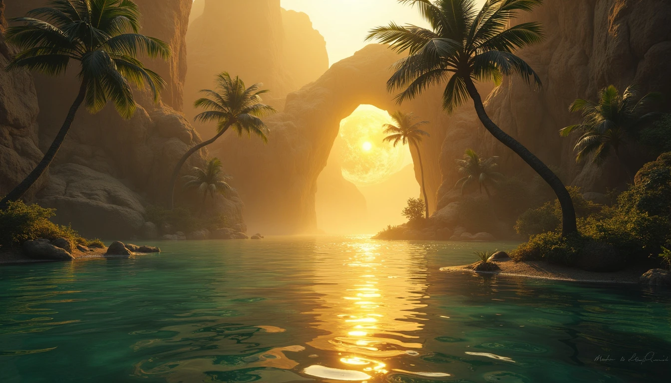 Miraculous Promise: As you approach the oasis, the landscape around you begins to subtly shift. The shadows of the palm trees seem to dance to the rhythm of an invisible breeze, and the water glows with a golden light, as if illuminated by a divine sun. As you reach out to touch the water, you feel a pulsing energy, as if the oasis were a portal to an unknown realm. Have you discovered more than just water and shade? Perhaps this oasis holds secrets beyond human comprehension.