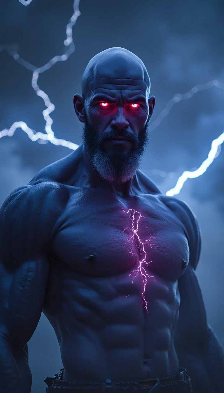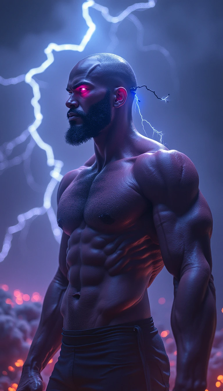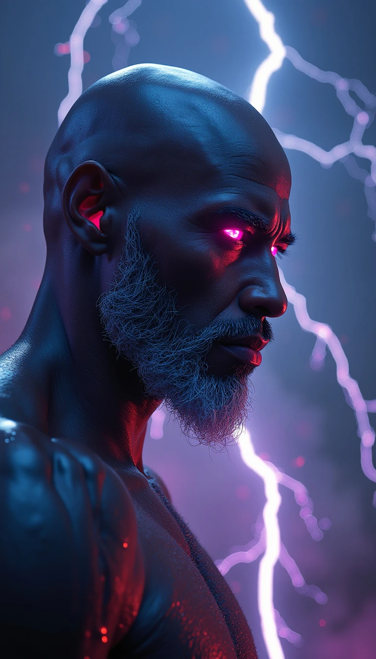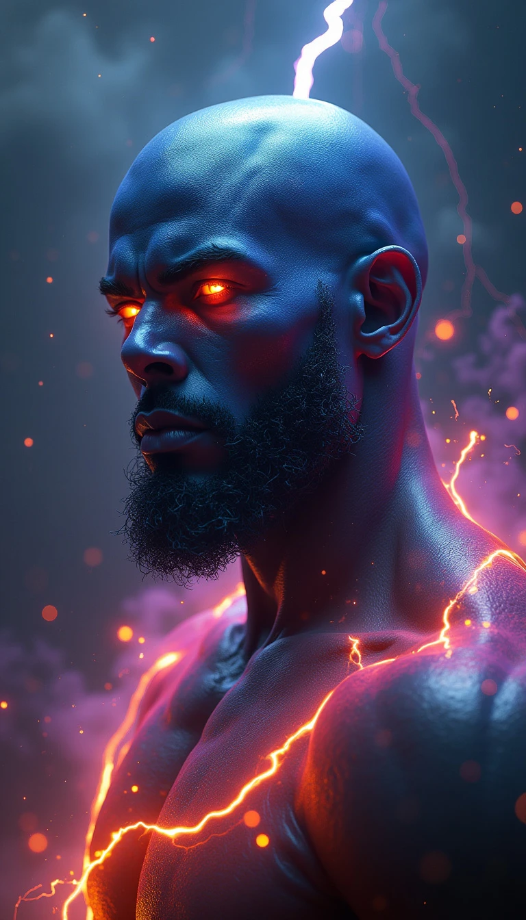 lightning strikes, 45-y-o bald head african-american ZEUS, High quality, UHD, Luminous Studio graphics engine, purple blue, cyan, octane render, cloudy haze, fiery embers, glowing eyes, dark atmosphere, darkness,