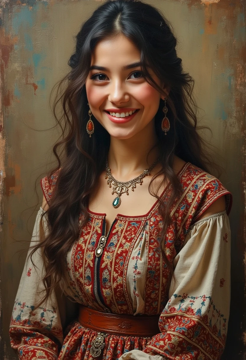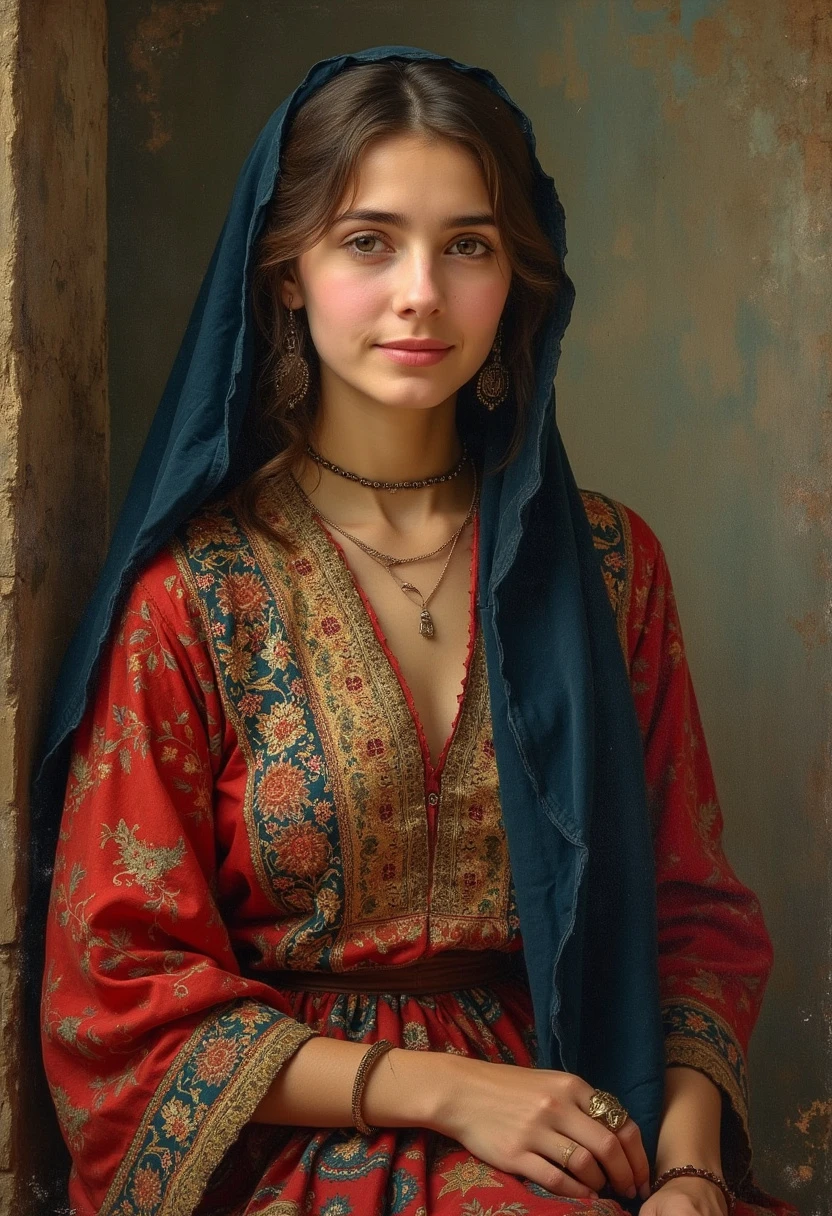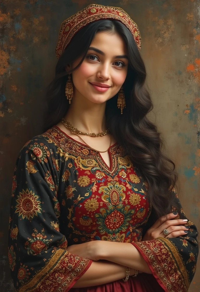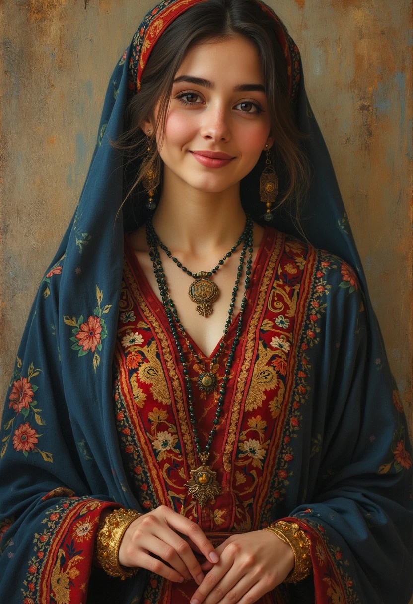 An artistic depiction of a beautiful Persian woman, with usual daily dress with Persian carpet design pattern, In the old photo frame of the art portrait in the gallery, in a local costume while looking at the camera and smiling from different countries, art painting, oil painting, impressionist and looking at the camera with a kind smile, art oil painting style