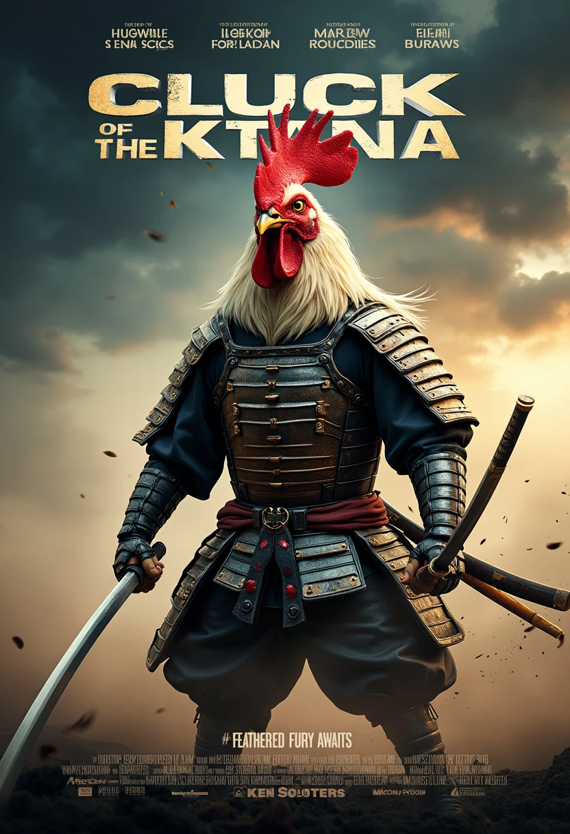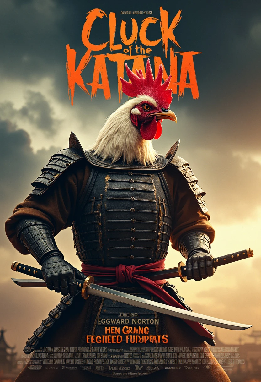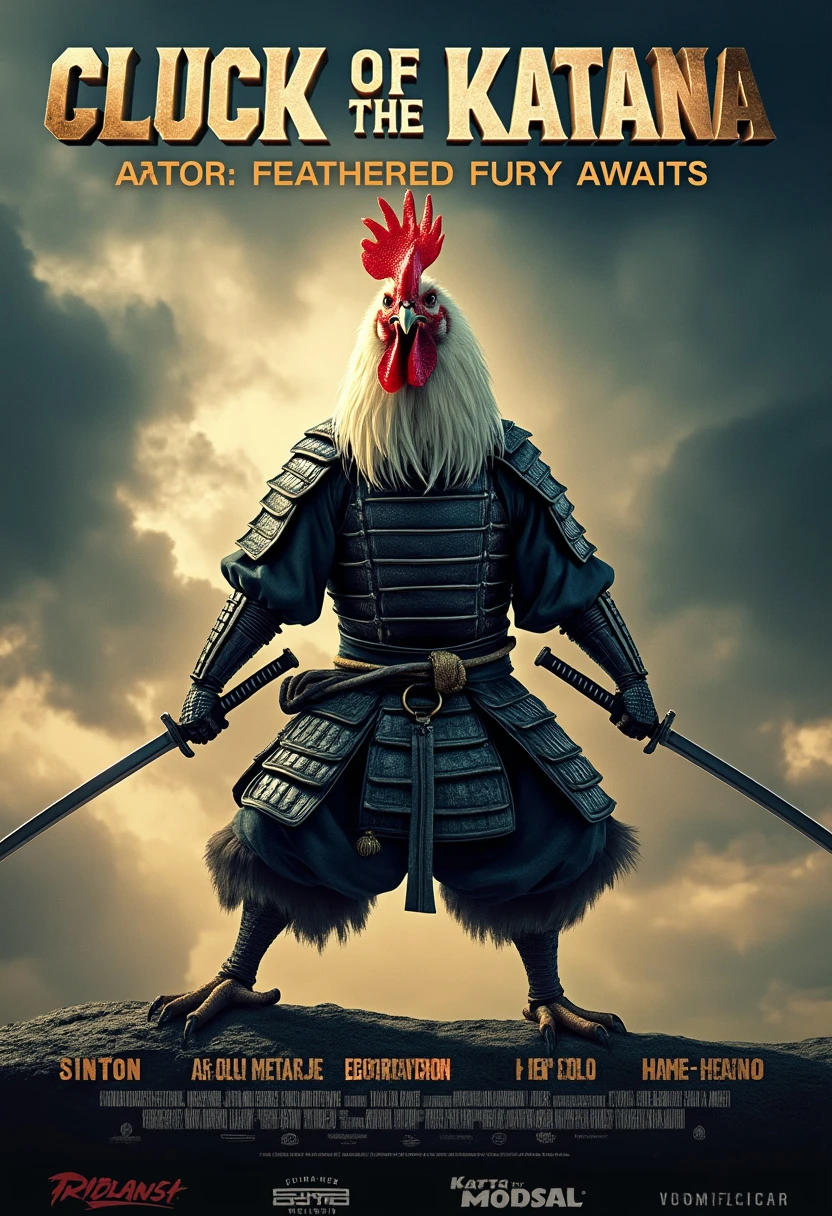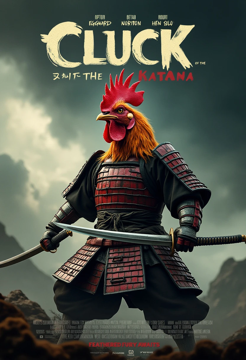 A Hollywood movie poster featuring a photorealistic chicken dressed in full samurai armor, wielding two katanas, with epic volumetric lighting casting dramatic shadows. The chicken stands in a battle-ready pose against a stormy sky, feathers ruffled, looking fierce and determined. The movie title 'Cluck of the Katana' is emblazoned across the top in bold, stylized lettering. Below, actor names like 'Eggward Norton' and 'Hen Solo' appear above the tagline: 'Feathered Fury Awaits.' Movie studio logos and credits are placed at the bottom in typical poster fashion. 4K, masterpiece quality