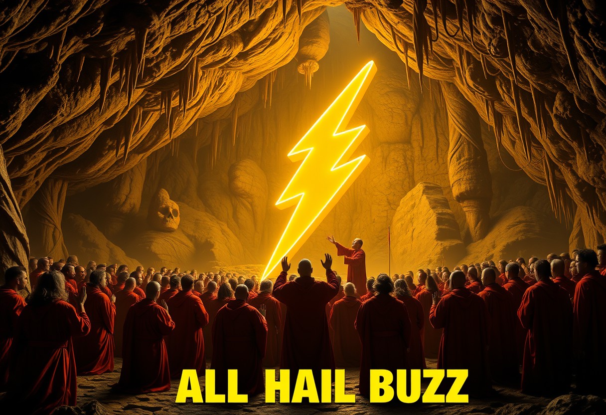 A group of cultists in red robes worship a giant glowing golden idol of a 3d lightning bolt symbol in a large cavern with stalactites hanging from the ceiling, the cavern is illuminated by the lightning bolt symbol's soft golden glow, most of the cultists are kowtowing to the lightning bolt symbol, one cultists stands in front of the lightning bolt symbol and preaches to the crowd, yellow text along the middle bottom of the scene spells out the words "ALL HAIL BUZZ"