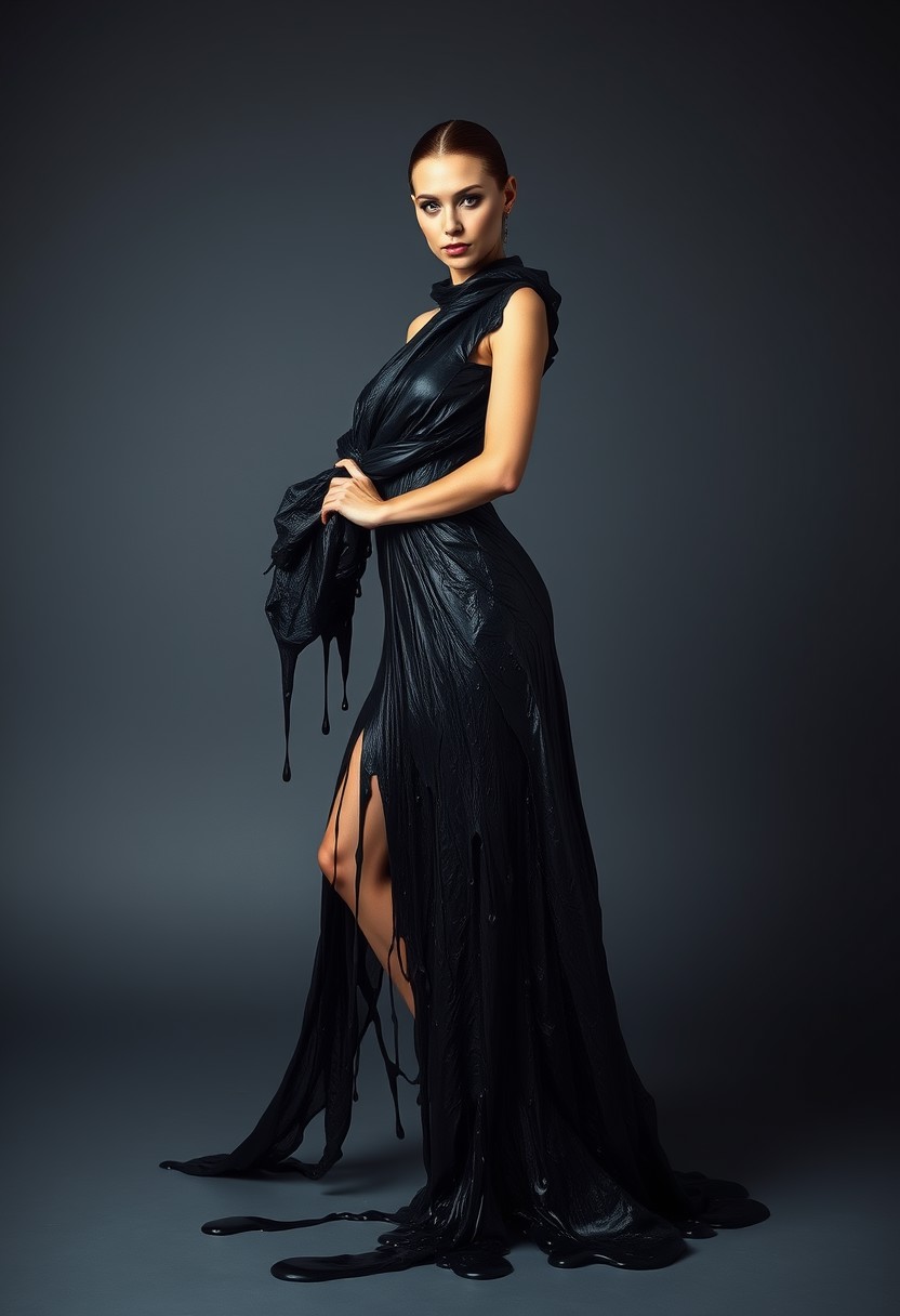 **Fashion photograph of a woman wearing a melting black dress. The Fabric of the dress is liquidizing and slowly melting off her body. Dynamic pose. Modern, conceptual fashion. The Woman is looking at the camera. Confident and fierce. Melting wax like effect on dress. Black dress is detailed, intricate and elaborate. Thin rivulets of melting fabric drip onto the ground at her feet. Editorial, Vogue, avante garde. If melting tar could be spun into a dress. Beautiful. Ultra detailed. Photo realistic**