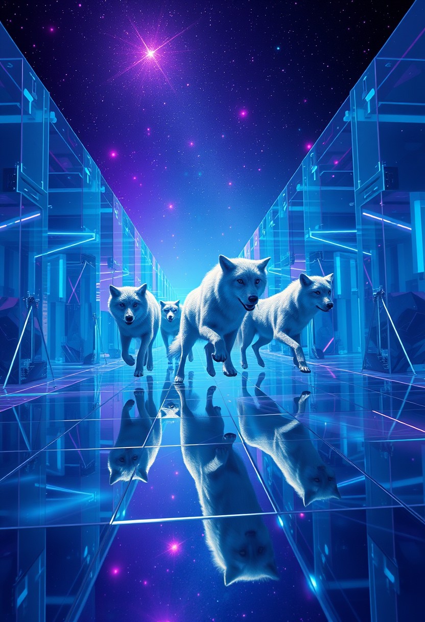 A pack of disco dancing wolves parkouring in zero gravity endless maze made of crystal glass and mirrors, shiny reflections and vaporwave lighting
