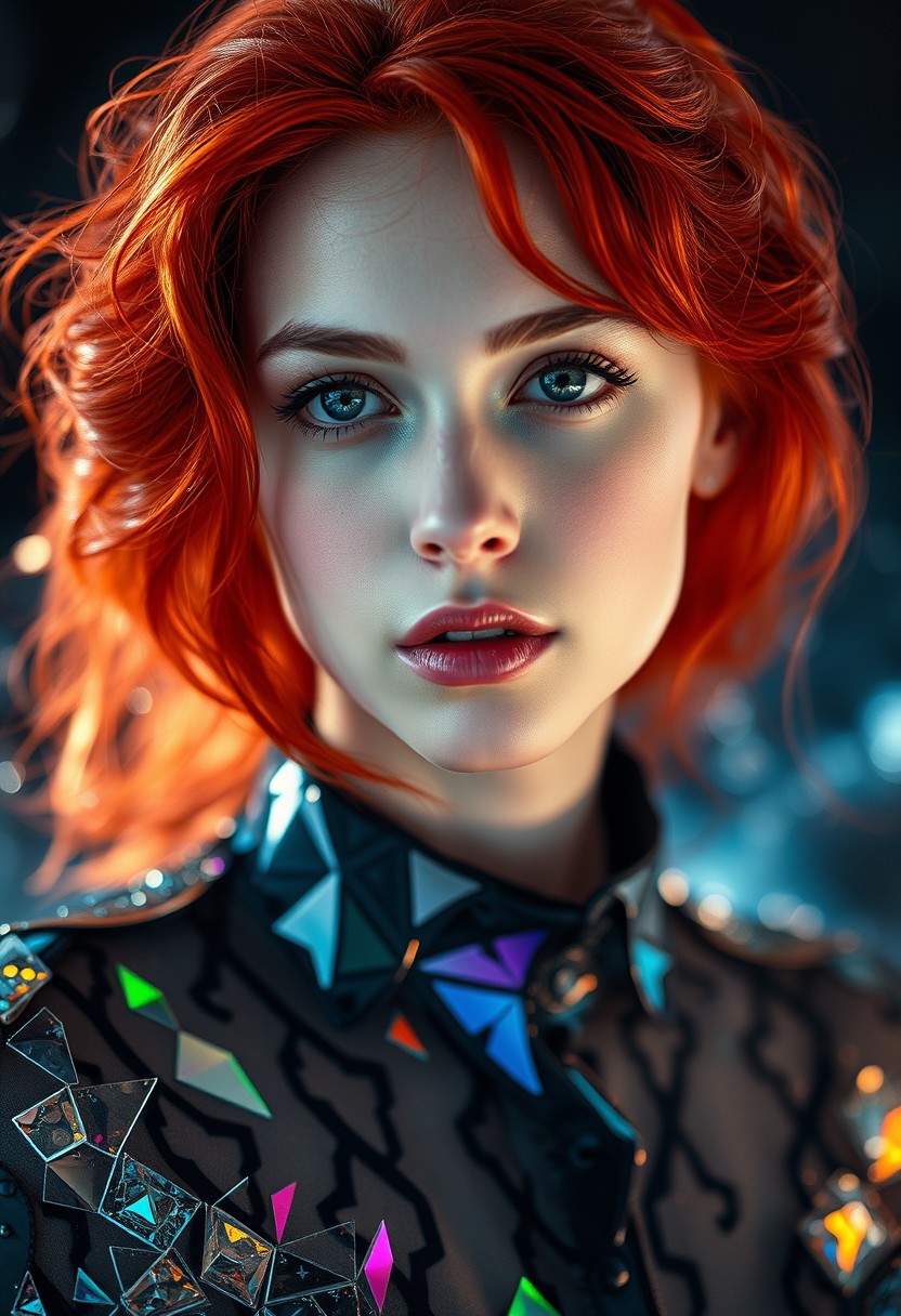 glass textures, a woman with red hair in the style of Tamara de Lampe, mythical, breathtaking beauty, perfection, divine presence, unforgettable, impressive, auras, rays, ultra high quality, masterpiece, sharp focus, depth of field, unreal engine, Broken Glass effect, no background, stunning, mythical being, energy, molecular, textures, iridescent and luminescent scales, breathtaking beauty, perfect, divine presence, unforgettable, impressive, breathtaking beauty, Volumetric light, auras, rays, vivid colors reflects