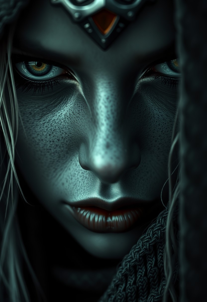 Extreme detail, highres, absurdres, face, cryptic, ArsMJStyle, dnddarkestfantasy, dark fantasy, stylized by alphonse mucha, loish and wlop, photograph, Jolien, Ilford HP5, photography, sci-fi, close-up, aidmaCODskins ArsMJStyle, dnddarkestfantasy