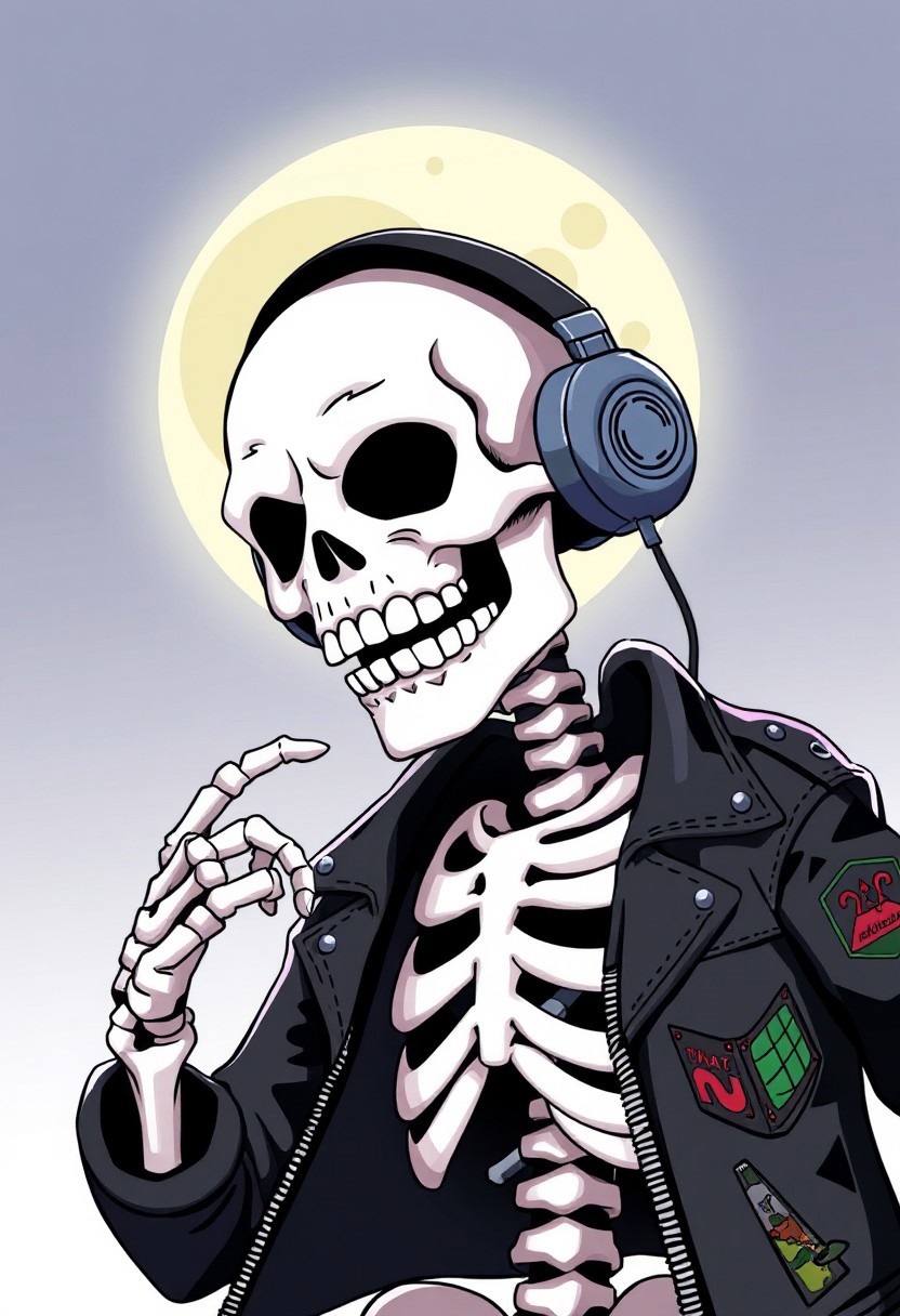 A cartoon skeleton wearing headphones and a leather jacket with patches is dancing under the moonlight. The skeleton has white teeth and is depicted in a hyper-realistic, white background, high-resolution style.
