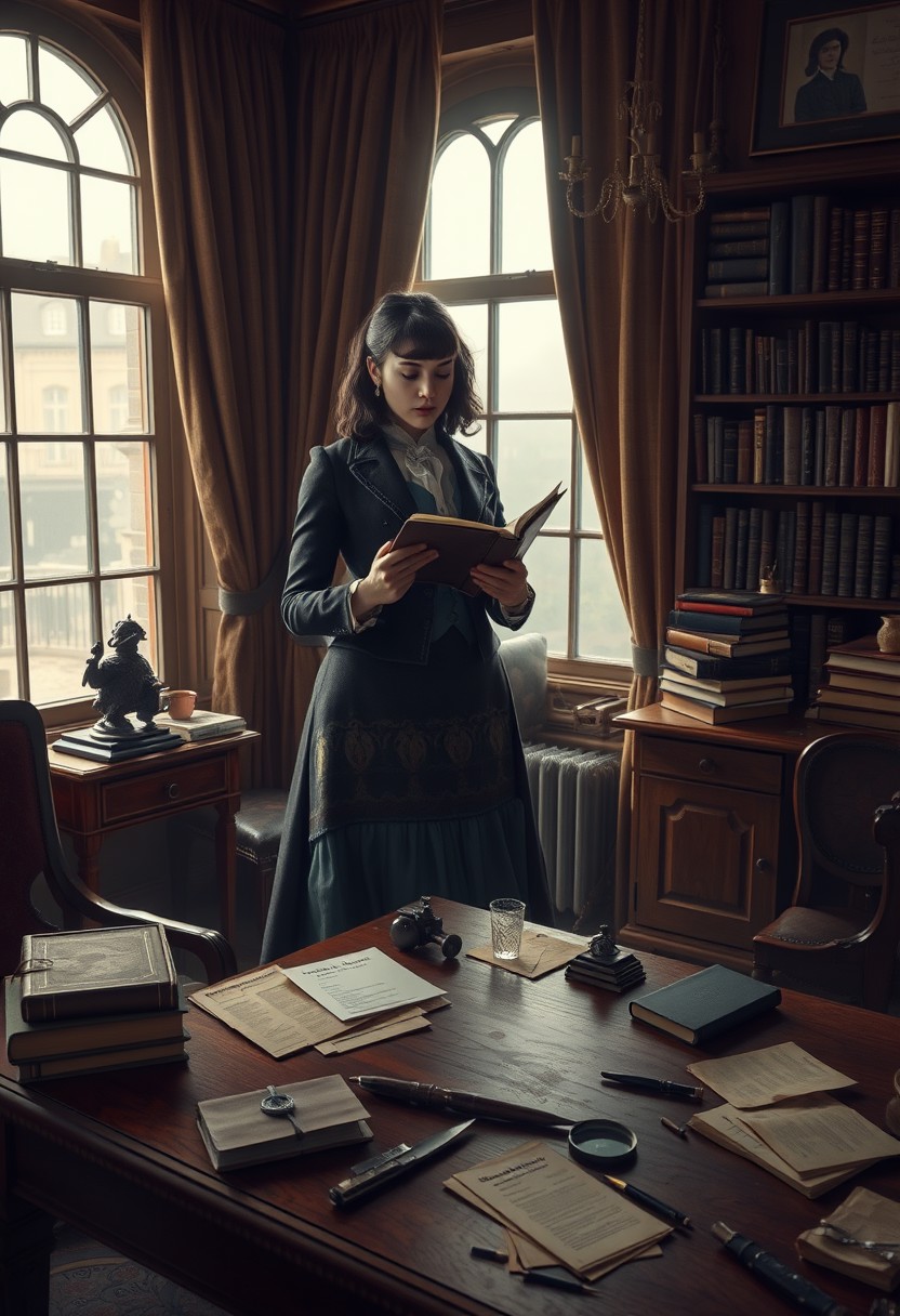 A detailed scene set in Victorian England, inspired by the world of Sherlock Holmes. The image should depict a mysterious and intelligent woman in her late twenties, dressed in 19th-century fashion, acting as Sherlock Holmes' assistant. She stands confidently in a dimly lit study filled with antique furniture, stacks of books, and various investigative tools. The room has a large window with heavy curtains, allowing only a sliver of London’s foggy street outside to seep through. On a wooden desk, there are letters, magnifying glasses, and clues scattered about. The woman is holding a notebook, deep in thought, with a subtle expression of determination and intelligence, as though she has just uncovered a critical piece of the puzzle. Her style reflects a blend of elegance and practicality, inspired by the Victorian era. The overall mood should evoke the intrigue and mystery typical of a Sherlock Holmes investigation