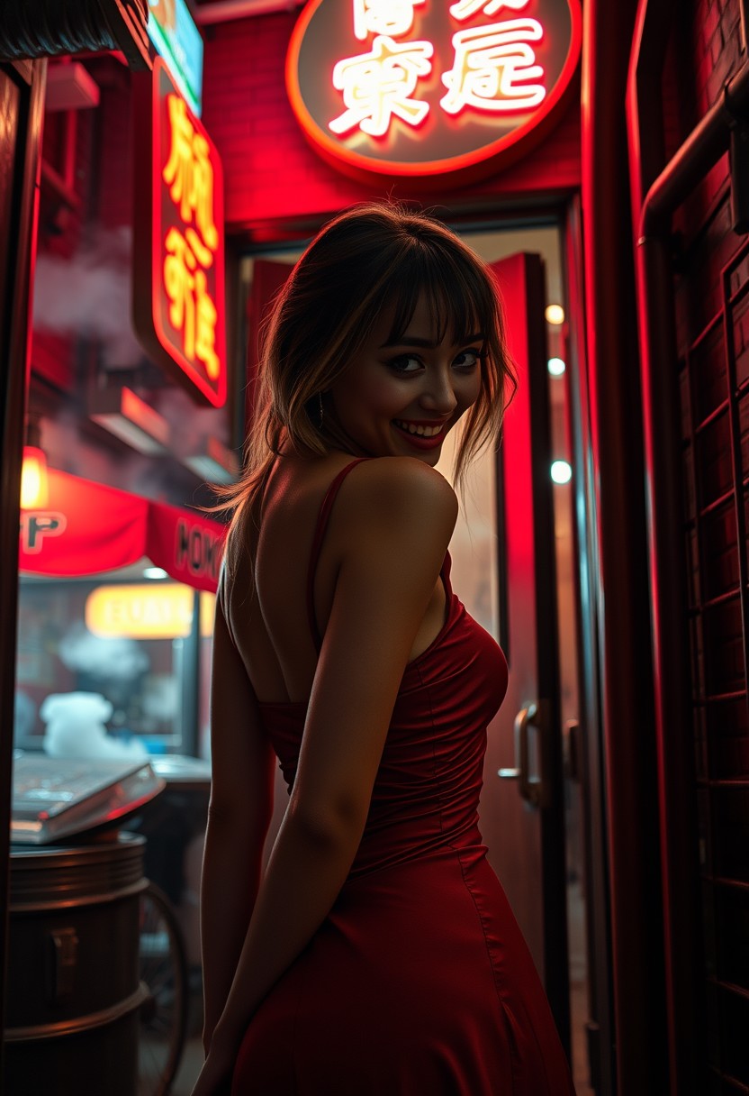 A mysterious Asian woman, seen from behind, stands in the doorway of a club, inviting you inside. She wears a revealing cocktail dress, with music pumping and lights flashing behind her. The scene is set in a dimly lit alley in a red-light district, with a nighttime BBQ food stall nearby, smoke rising up. Neon lights illuminate the brick architecture and drainpipes around her. She has light brown hair and eyes, long bangs, and makeup, with parted lips showing her teeth and tongue in a welcoming, happy expression. The atmosphere is suspenseful yet cozy, with high contrast, shadows, and dramatic 1990s-style cinematic lighting. The photorealistic image captures ultra-detailed skin pores and realistic texture, emphasizing the dark, chiaroscuro, low-key setting