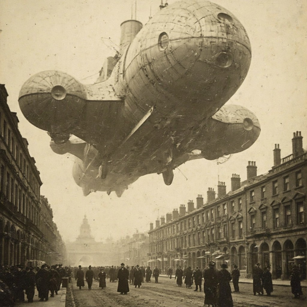 01dPh0t0 dark, shadow, distorted, grainy, film grain, Victorian, An aged worn sepia monochrome 1800s photograph of an (enormous and intricately detailed high-tech science fiction alien spacecraft):2 hovering over 1890s London, low angle looking up, ominous, looming, massive sense of scale, nervous people on the streets looking upward