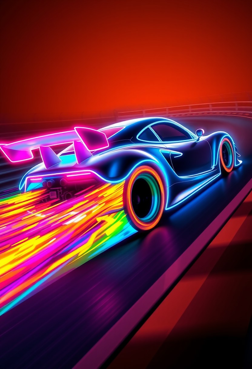 "Image of a neon outline of a race car, speeding along a winding raceway. The car's tires are ablaze with a vibrant, swirling mixture of colors, as if the trail they leave behind is made of pure, unadulterated color. A flurry of colors blasts from the end of the tires, radiating outwards in a mesmerizing display of light and energy. The neon outline of the car is bold and striking, set against a dark background that allows the colors to pop. The raceway's curves and bends are illuminated by the car's trail, creating a dynamic and immersive visual effect. Style: vibrant, dynamic, and futuristic, with a focus on capturing the speed and energy of the racing experience." Absurdres Highest-Quality, 4k