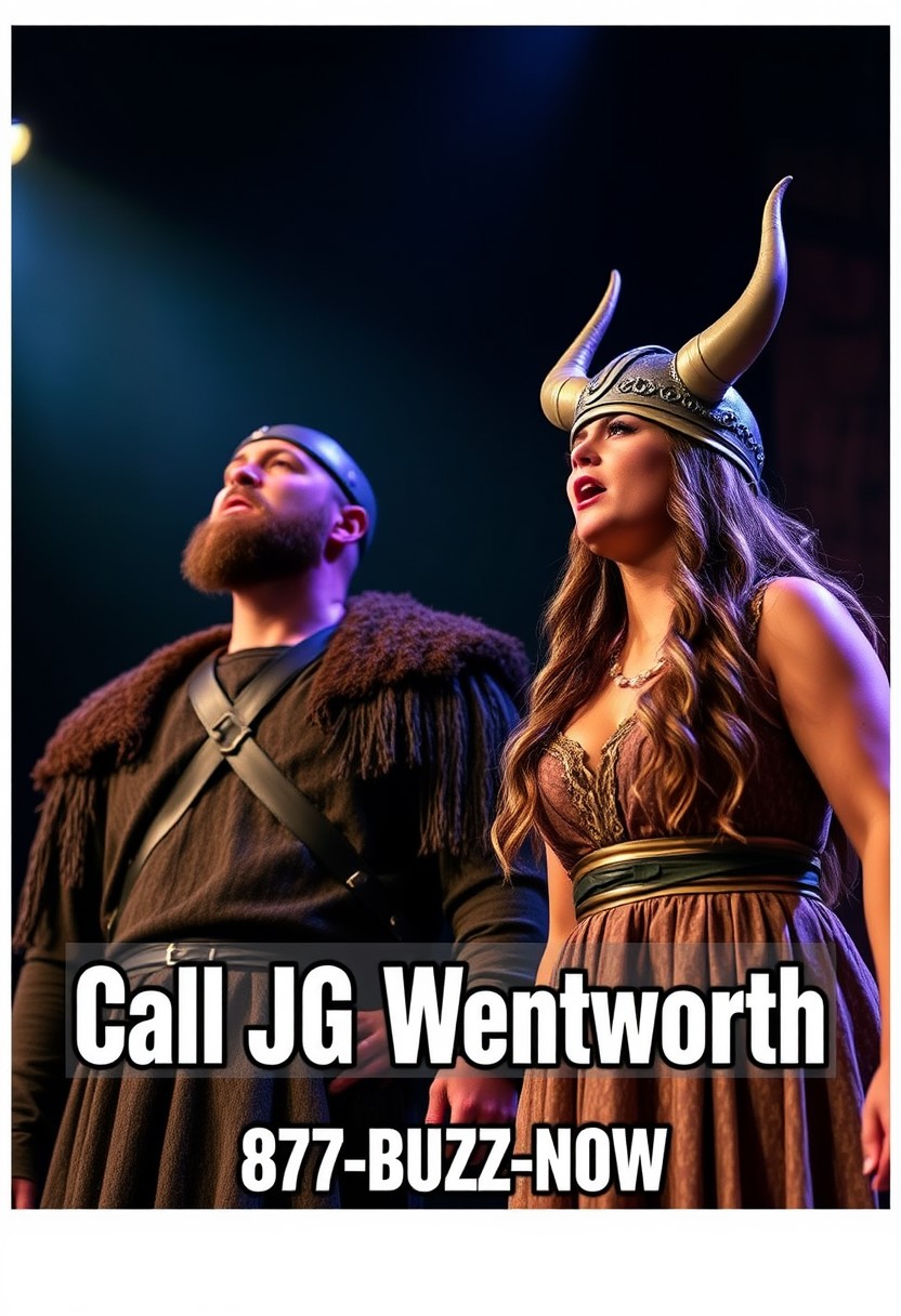 score_9, score_8_up, score_7_up, 4K, UHD, lifelike, Viking Opera, man and woman on stage, wearing Viking clothing, Viking helmet, singing "Call JG Wentworth" Caption that reads "877-BUZZ-NOW"