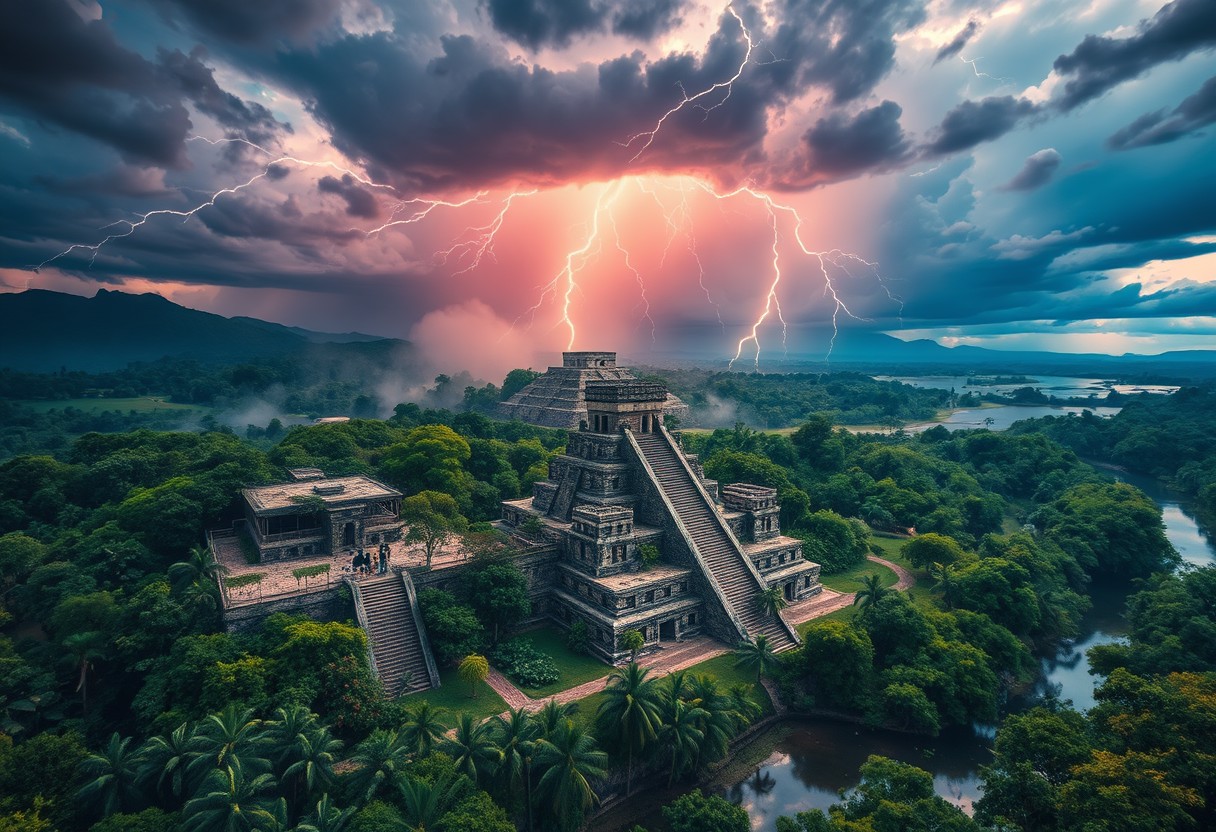 A breathtaking aerial view of the legendary Mayan mega structures, largest Mayan pyramid, reservoir, river, large Mayan work force building, vibrant thriving civilization, people working, captured in stunning 8K resolution,