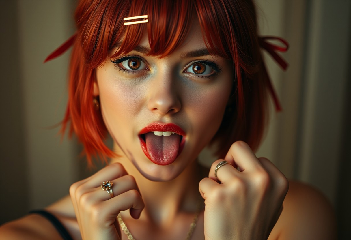 8k analog photo, (realistic:1.2), best studio quality, masterpiece, super realistic, extreme cinematic,beautiful soft light, aesthetic, hight detailed realistic light and shadows, realistic light aberration, redhead 18 years old girl, ribbons, necklace, ring on third finger-fist A-P hand, hight quality detailed perfect skin, polychromatic heterochromic red eye contact, alena aenami artstaion wining award art. A confident and sexy young woman with short red hair, styled with a hair clip resembling the '>_' symbol. She has a playful, mischievous expression, exuding a bold and flirtatious vibe. The mouth is wide open and tongue is out.