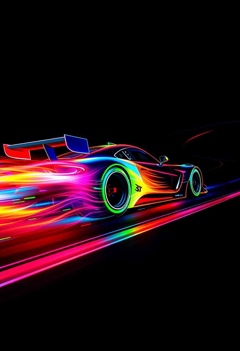 "Image of a neon outline of a race car, speeding along a winding raceway. The car's tires are ablaze with a vibrant, swirling mixture of colors, as if the trail they leave behind is made of pure, unadulterated color. A flurry of colors blasts from the end of the tires, radiating outwards in a mesmerizing display of light and energy. The neon outline of the car is bold and striking, set against a dark background that allows the colors to pop. The raceway's curves and bends are illuminated by the car's trail, creating a dynamic and immersive visual effect. Style: vibrant, dynamic, and futuristic, with a focus on capturing the speed and energy of the racing experience." Absurdres Highest-Quality, 4k