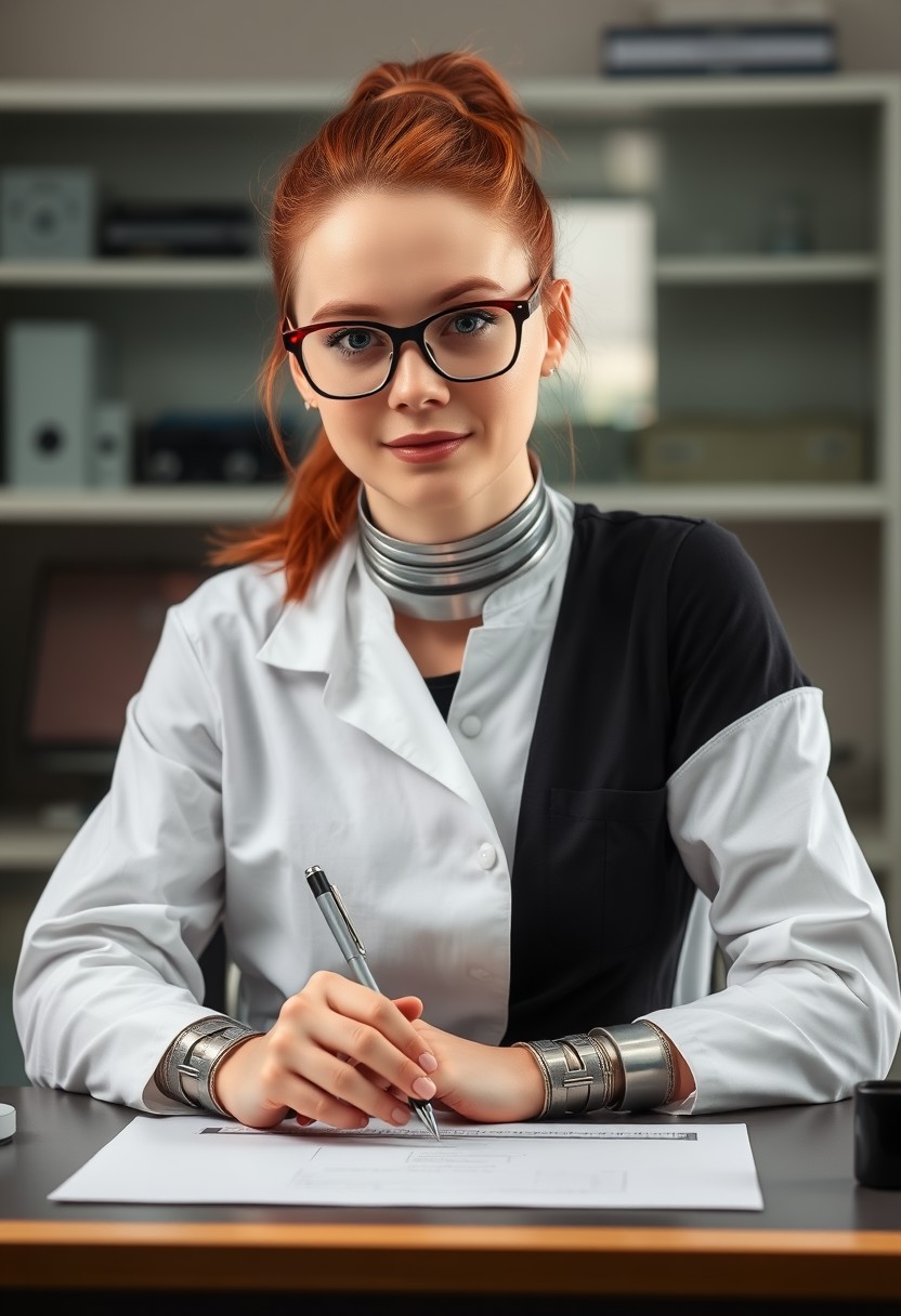 A 25 year old woman with nardy glasses and red hair in a ponytail sitting behind a desk. She wears a white laboratory cleak and a bnlack top. Her hands are on the table in front of her holding a pen and a ruler. She has a thich silver band of metal around the neck and likewise such bands of metal around the wrists.