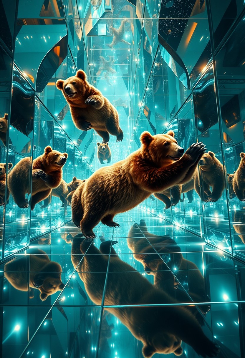 A group of euphoric grizzly bears floating in zero gravity endless maze of crystal glass and mirrors, shiny reflections and surreal lighting, infinity